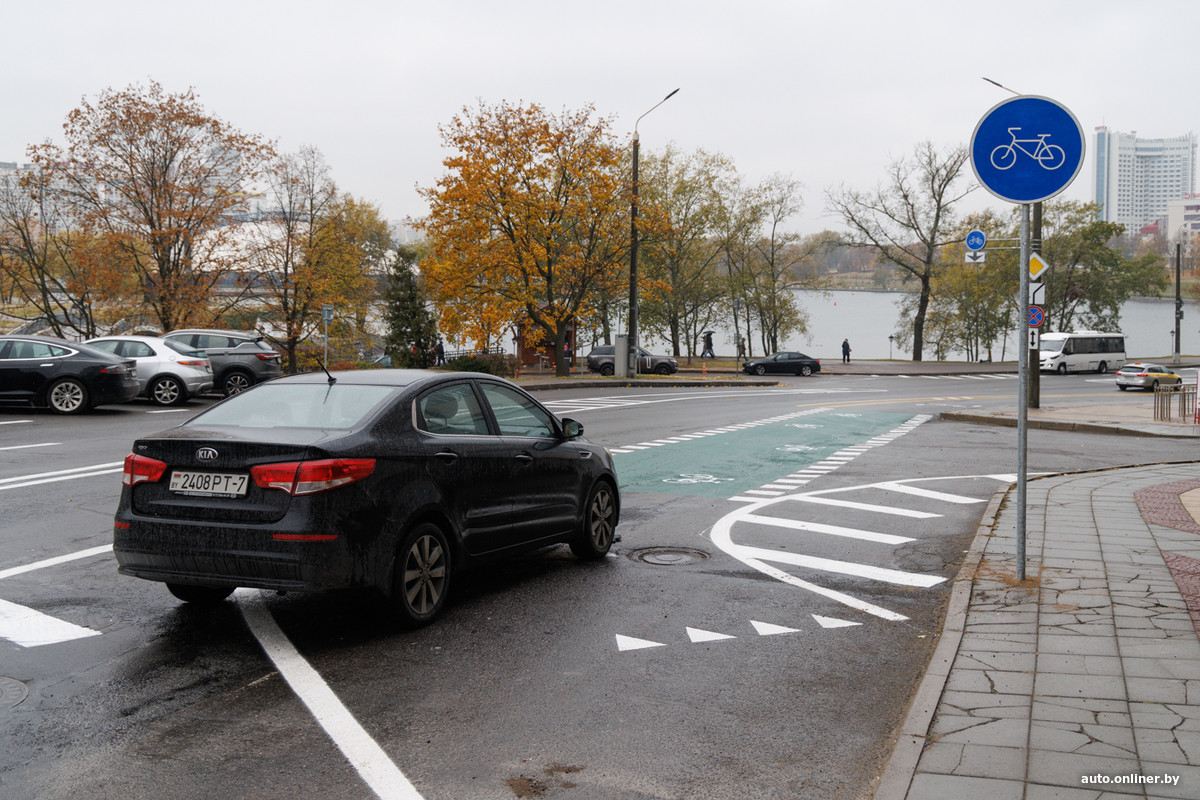 Выезд на велополосу, если двигаться от улицы Богдановича, организован не сразу от перекрестка, а чуть поодаль. Примечательно, что прямо на выезде мы застали стоящий автомобиль без водителя. Как долго машина там стояла — не известно.