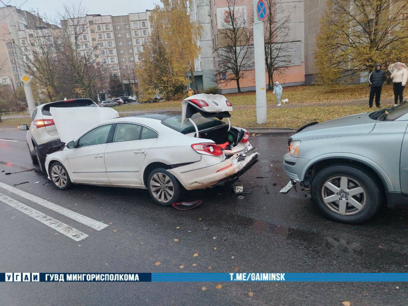 — 21-летний водитель Volvo, по предварительной информации, из-за несоблюдения безопасной дистанции совершил столкновение с двигавшимся в попутном направлении автомобилем Volkswagen, который от удара совершил наезд на стоящий впереди автомобиль Nissan, — сообщает ГАИ Минска.