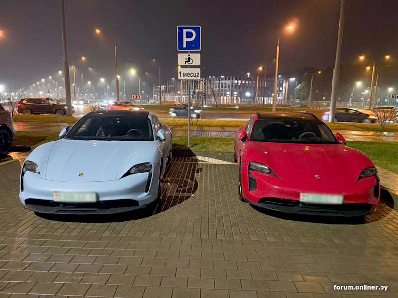 На парковке в «Новой Боровой» заметили симпатичную инсталляцию: два Porsche Taycan — голубой и ярко-красный. Даже номера у электромобилей почти одинаковые, различается только серия. Все хорошо, вот только место, где припарковали эти авто, может вызывать споры.