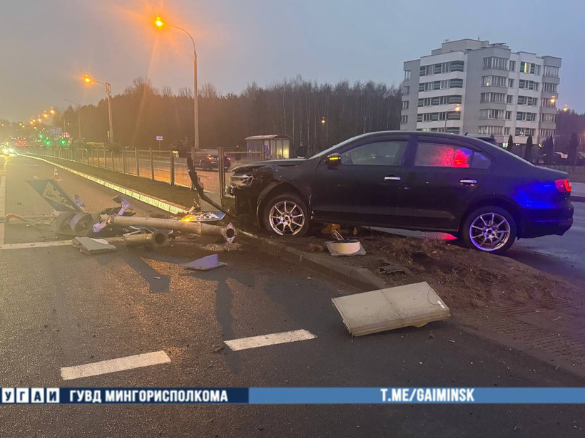 Авария произошла сегодня около 08:20 в Минске. 48-летняя водитель Volkswagen ехала по улице Франциска Скорины и вблизи пересечения с улицей Жасминовой выехала за пределы дороги, сбила светофор и врезалась в ограждение.