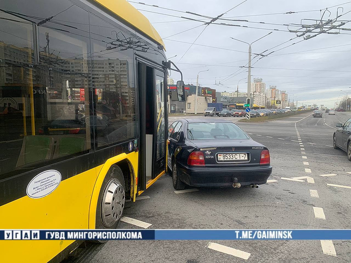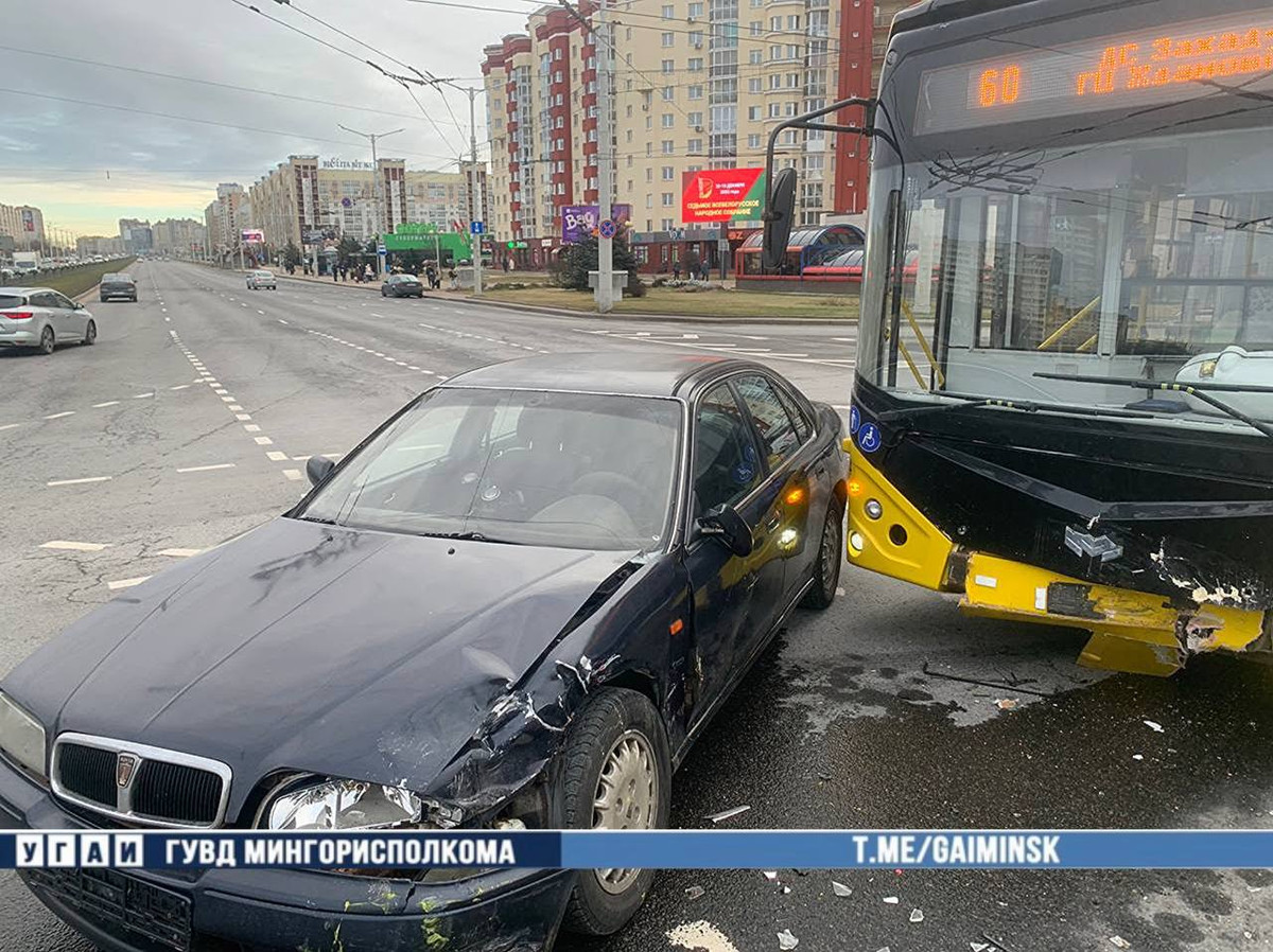 «Сегодня около 11:30 34-летний водитель автомобиля Rover, двигаясь по улице Притыцкого, по предварительной информации, на перекрестке с улицей Лобанка осуществил поворот налево на запрещающий красный сигнал светофора и не предоставил преимущество автобусу, спровоцировав столкновение с ним», — сообщает Госавтоинспекция.