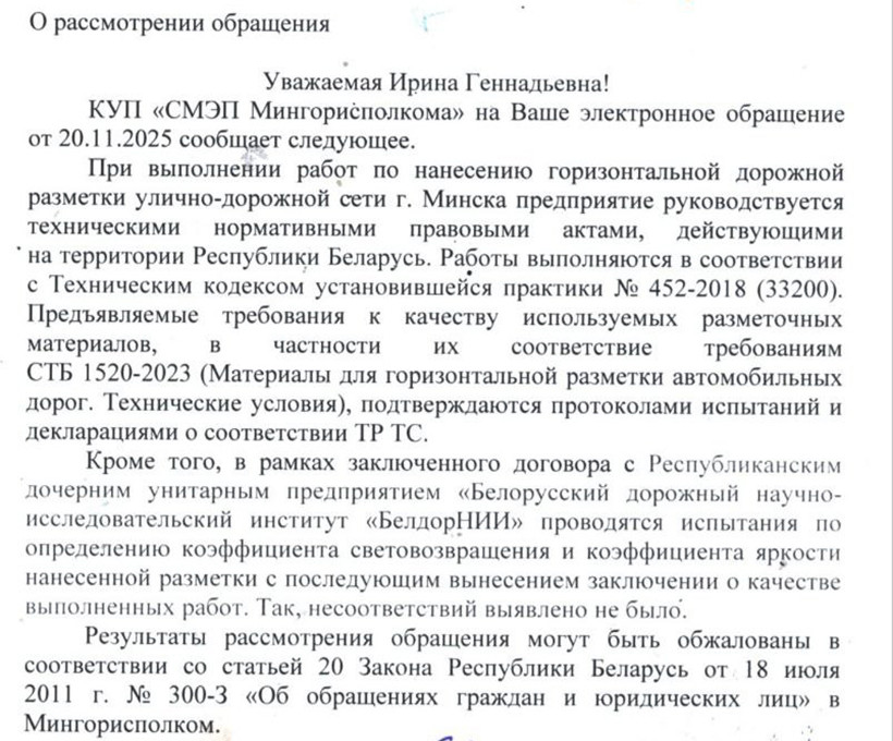 В ответе, который направили Ирине из «СМЭП Мингорисполкома», значится, что при нанесении разметки соблюдаются требования соответствующих технических кодексов и стандартов как в части выполнения работ, так и в отношении качества используемых материалов.