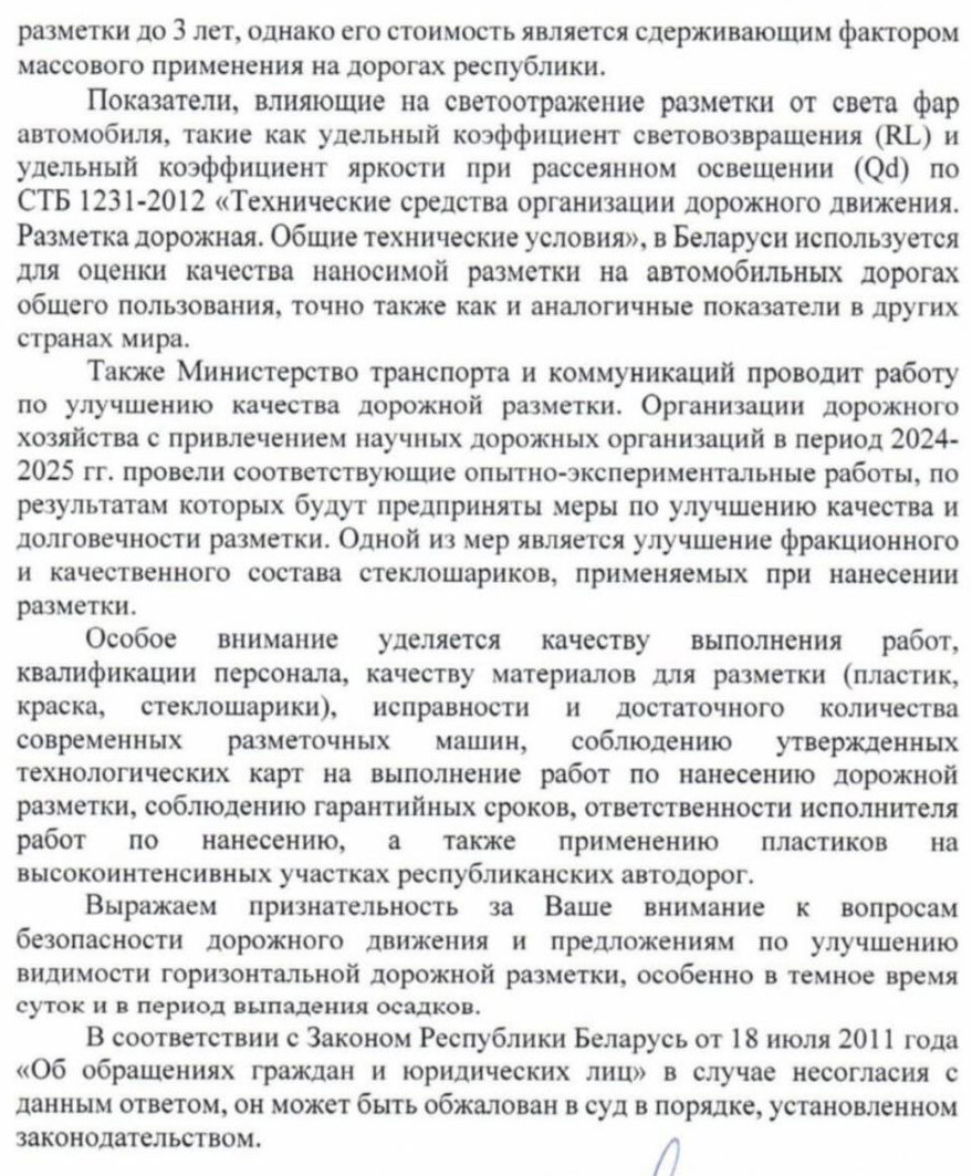 «Кроме того, в рамках заключенного договора с Республиканским дочерним унитарным предприятием „Белорусский дорожный научно-исследовательский институт «БедорНИИ»“ проводятся испытания по определению коэффициента световозвращения и коэффициента яркости нанесенной разметки с последующим вынесением заключения о качестве выполненных работ. Так, несоответствий выявлено не было», — заверили в СМЭП.