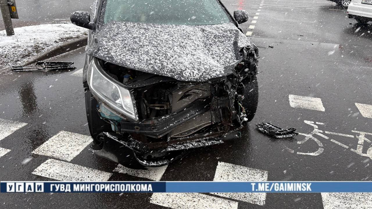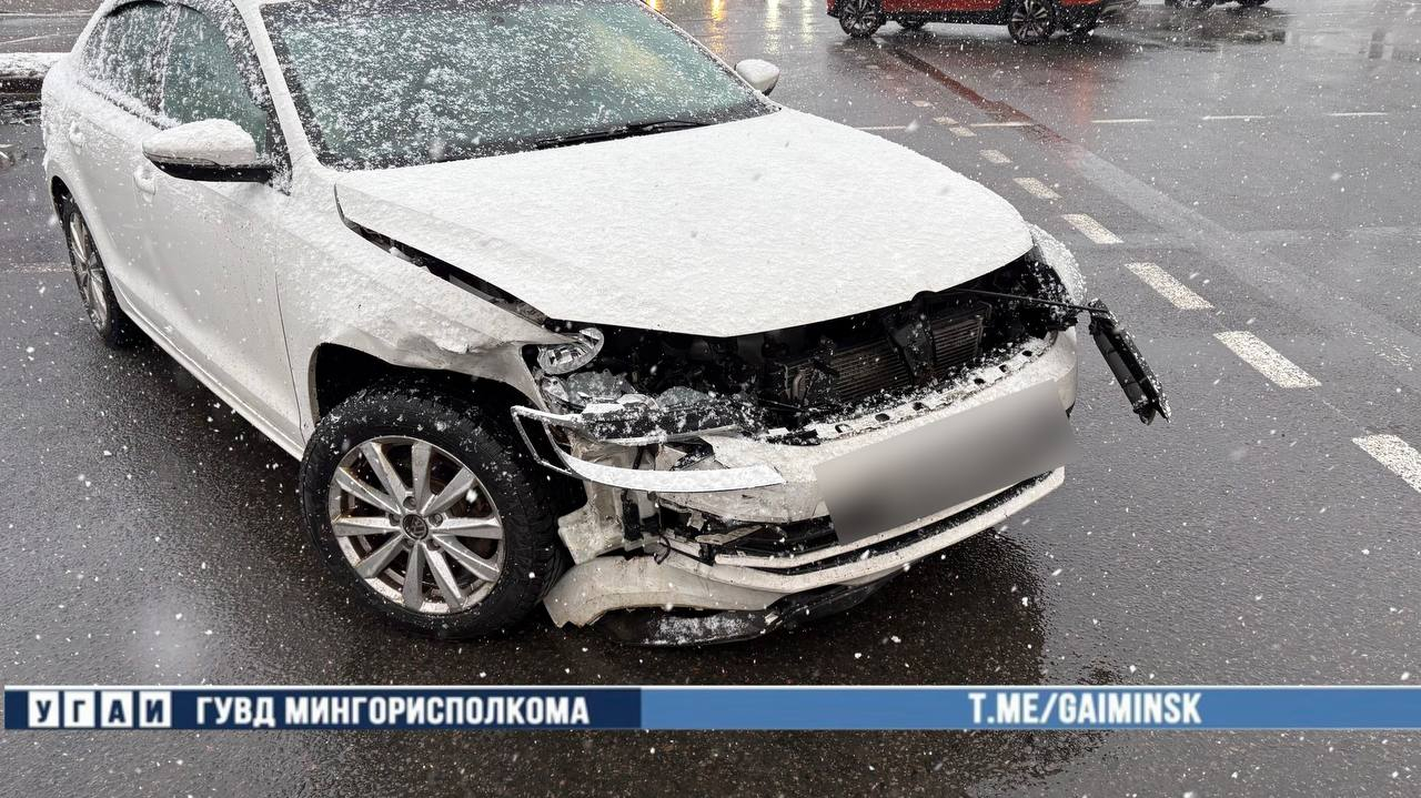 ГАИ Минска сообщила об аварии, которая произошла сегодня днем в Минске. 34-летний водитель Volkswagen, двигаясь по улице Одинцова, по предварительной информации, при повороте налево на улицу Якубовского не уступил дорогу автомобилю Kia, который ехал во встречном направлении, и столкнулся с ним.