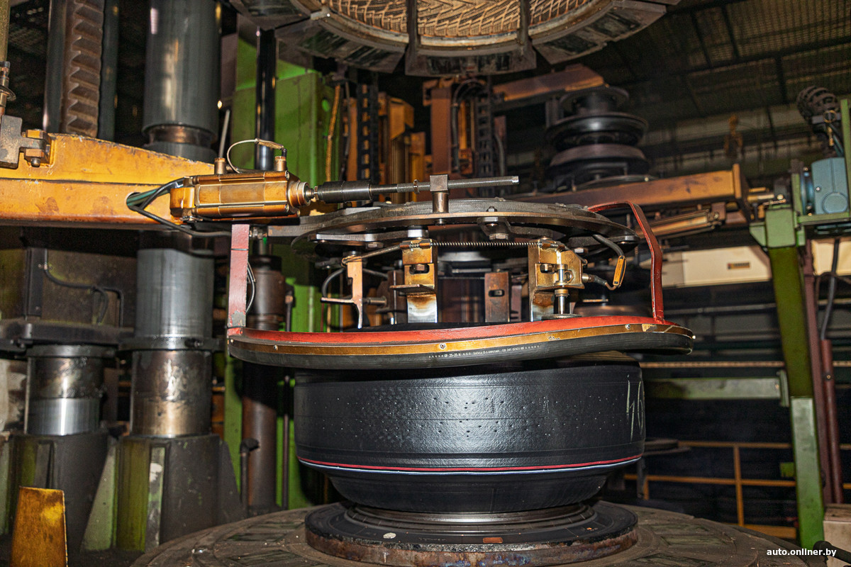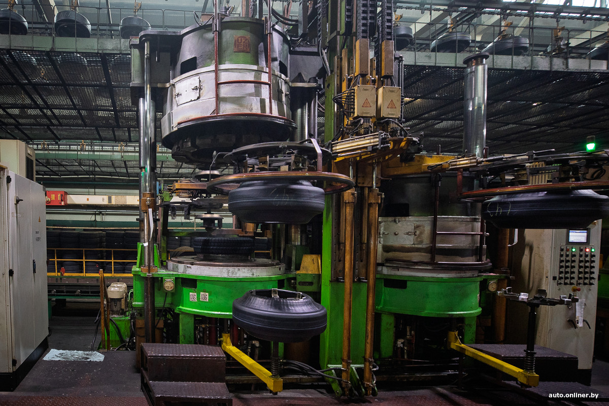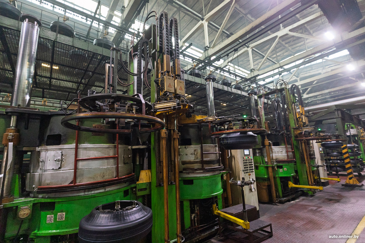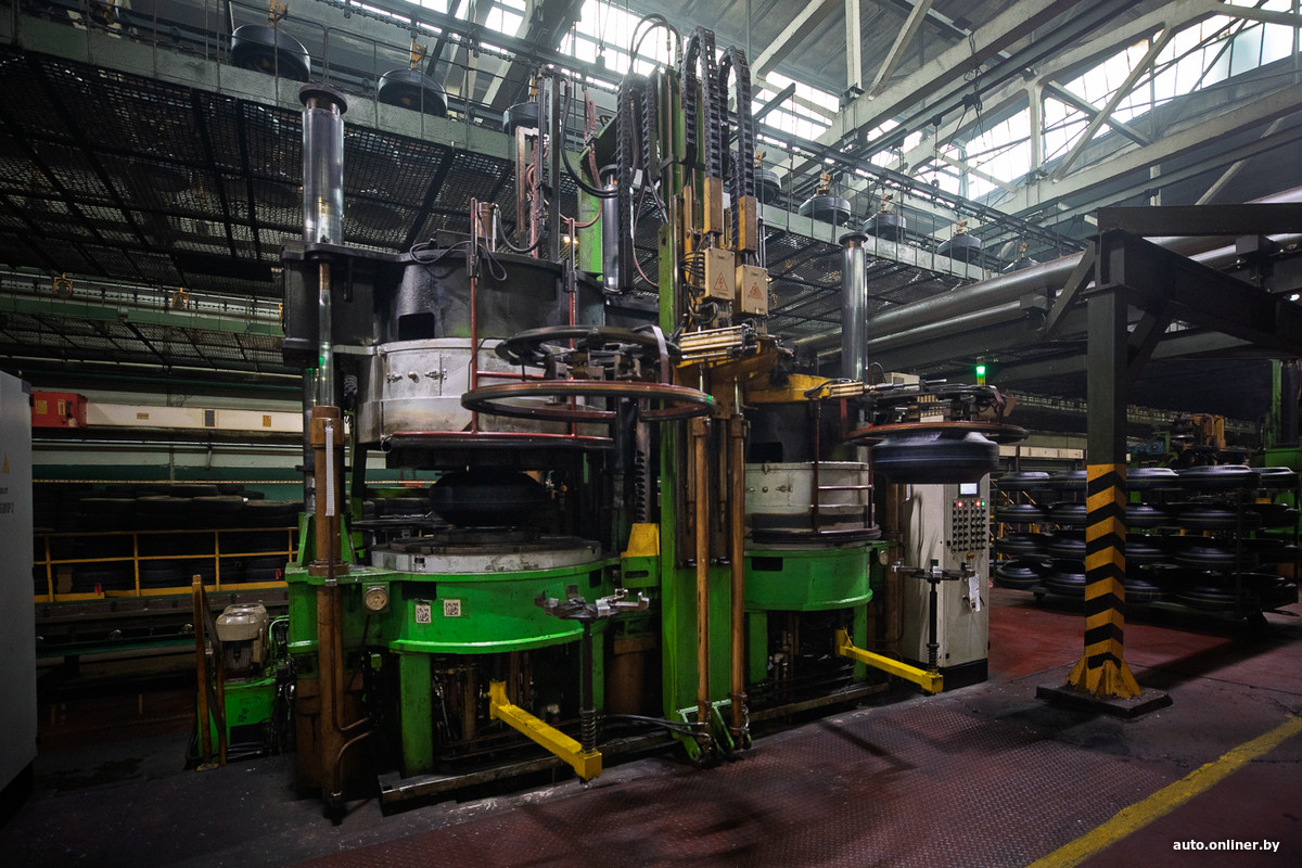 Впереди — ряды вулканизационных прессов. Рядом с ними находятся столы со сменным запасом заготовленных сырых шин. Бросается в глаза то, что рабочих здесь мало.