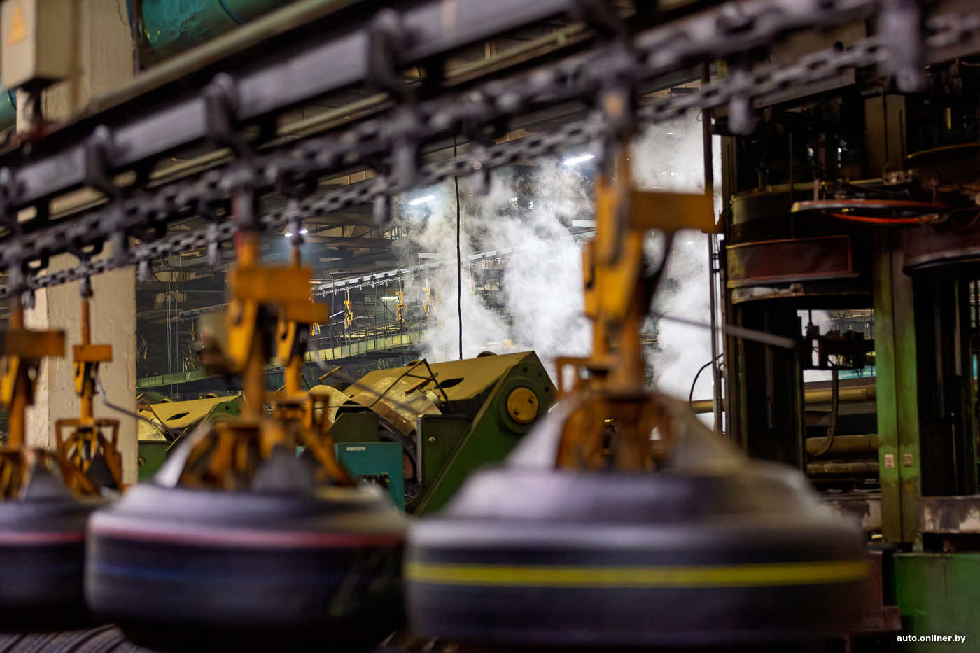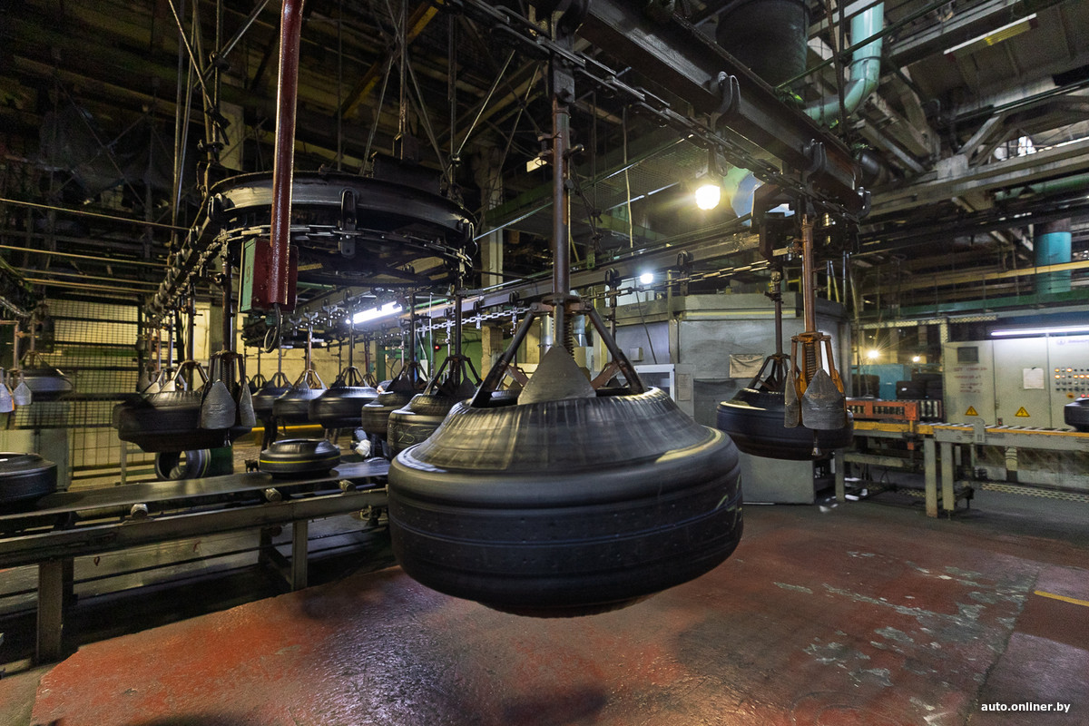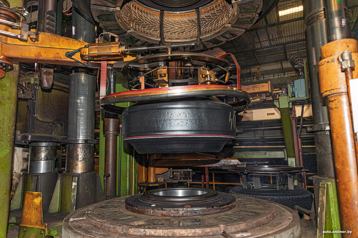 Впереди — ряды вулканизационных прессов. Рядом с ними находятся столы со сменным запасом заготовленных сырых шин. Бросается в глаза то, что рабочих здесь мало.