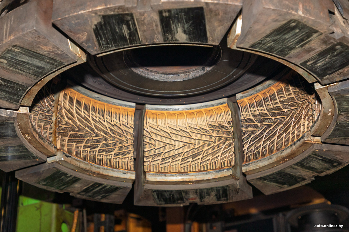 Как устроен вулканизационный пресс? Кольцо разделено на восемь секторов, которые формируют протектор — на металле можно рассмотреть характерный рисунок. Похоже на пирог с восемью кусочками — опять кухонная ассоциация.