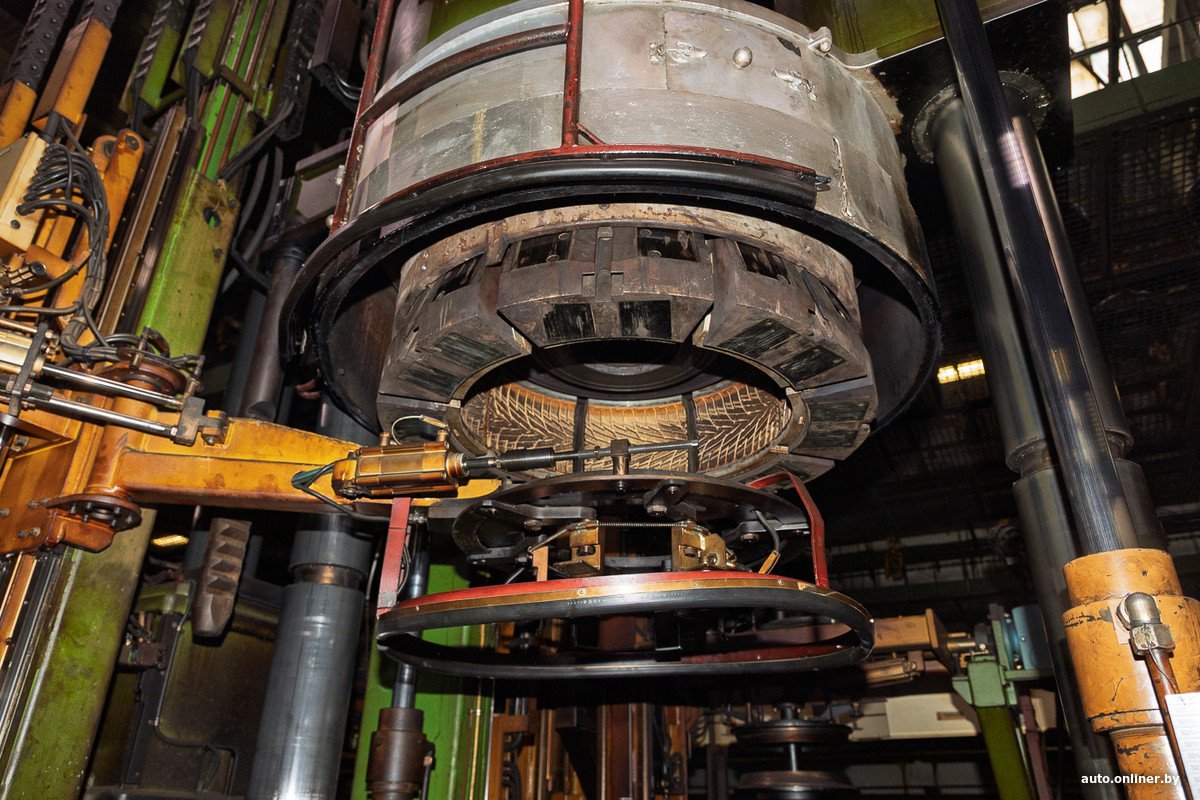 В автоматическом режиме загрузчик укладывает сюда шину, выставляя на нижнее бортовое кольцо, или, как здесь говорят, на нижнюю постель пресс-формы. Там хорошо читается рисунок, который после вулканизации отпечатается на боковине готовой покрышки. Все надписи, горные вершины и снежинки — вот они. Сверху, соответственно, размещено верхнее бортовое кольцо, или верхняя постель пресс-формы.