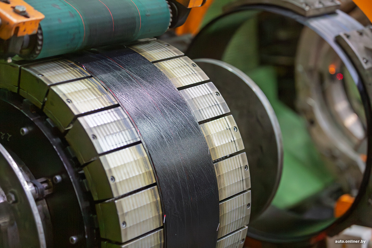 — Одновременно формируется, условно говоря, верхняя часть шины. Укладываются два слоя металлобрекера: нитки идут крест-накрест, поэтому покрышка и держит форму. Потом идет навивка экранирующего слоя — это то, благодаря чему шина выдерживает большие скорости. Конкретно здесь используется усиленная навивка, у нее другой индекс скорости. И затем — протектор.