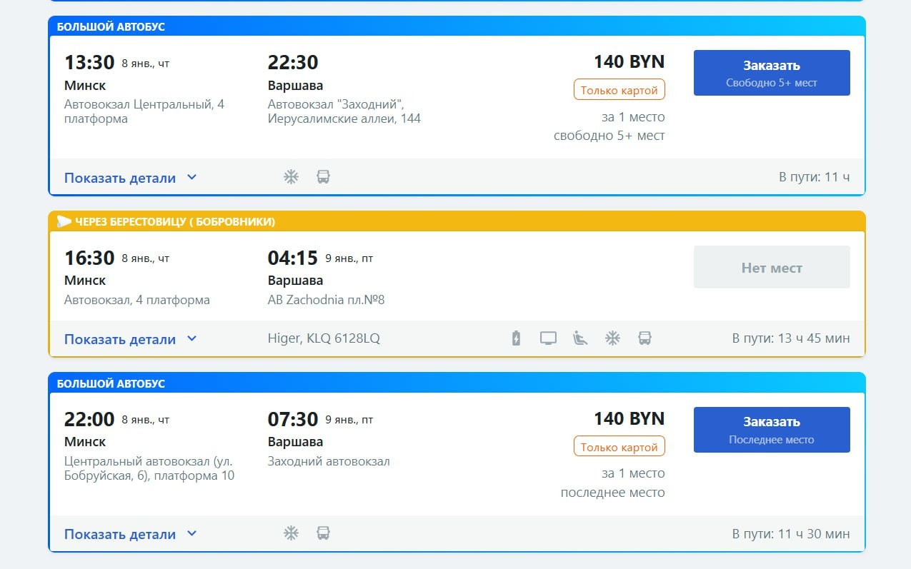Как понять, через какой пункт пропуска следует автобус? На сайте и в приложении сервиса „Атласбас“ международные рейсы, следующие через пункт пропуска „Берестовица“, отдельно выделены оранжевой плашкой, через „Брест“ — обведены традиционной синей рамкой. Кстати, для удобства пассажиров в телеграм-канале „Атласбас: граница онлайн“ размещается оперативная информация о ситуации на границе, очередях из автобусов, возможных изменениях в расписании.