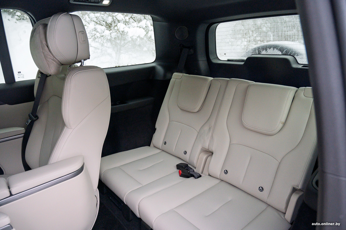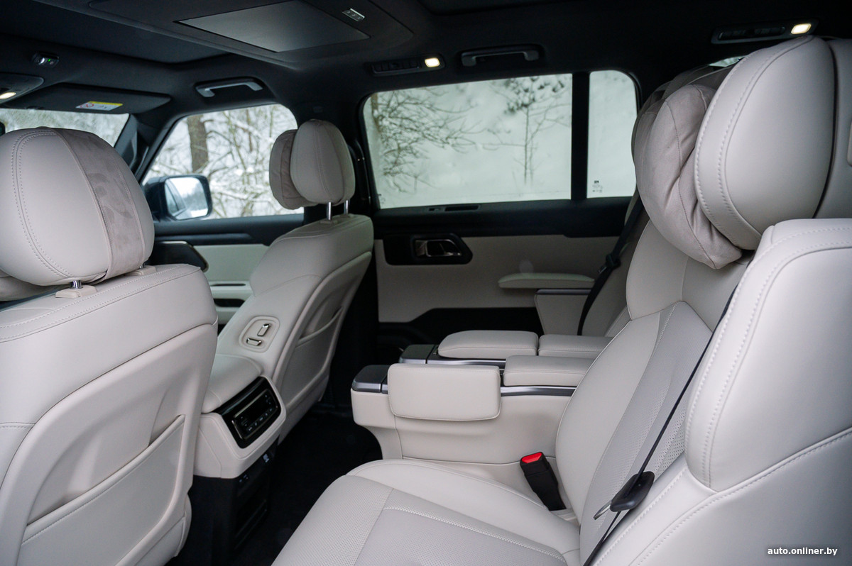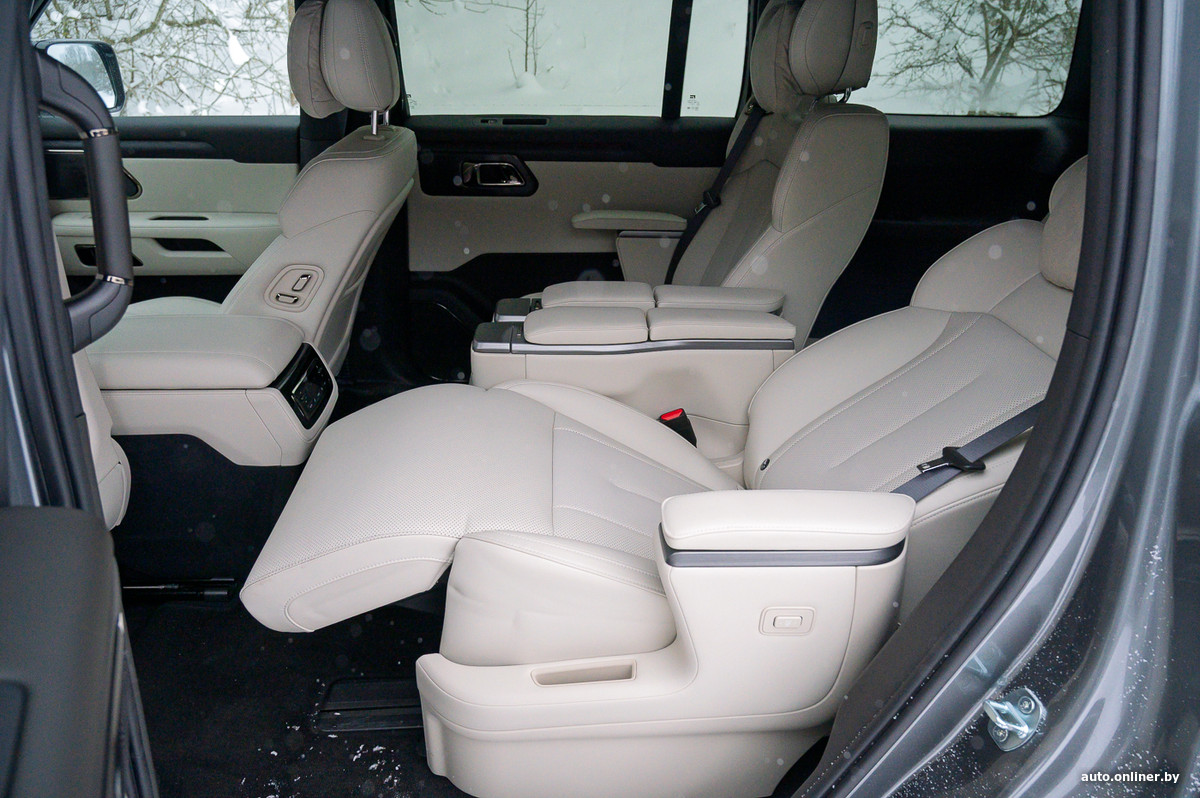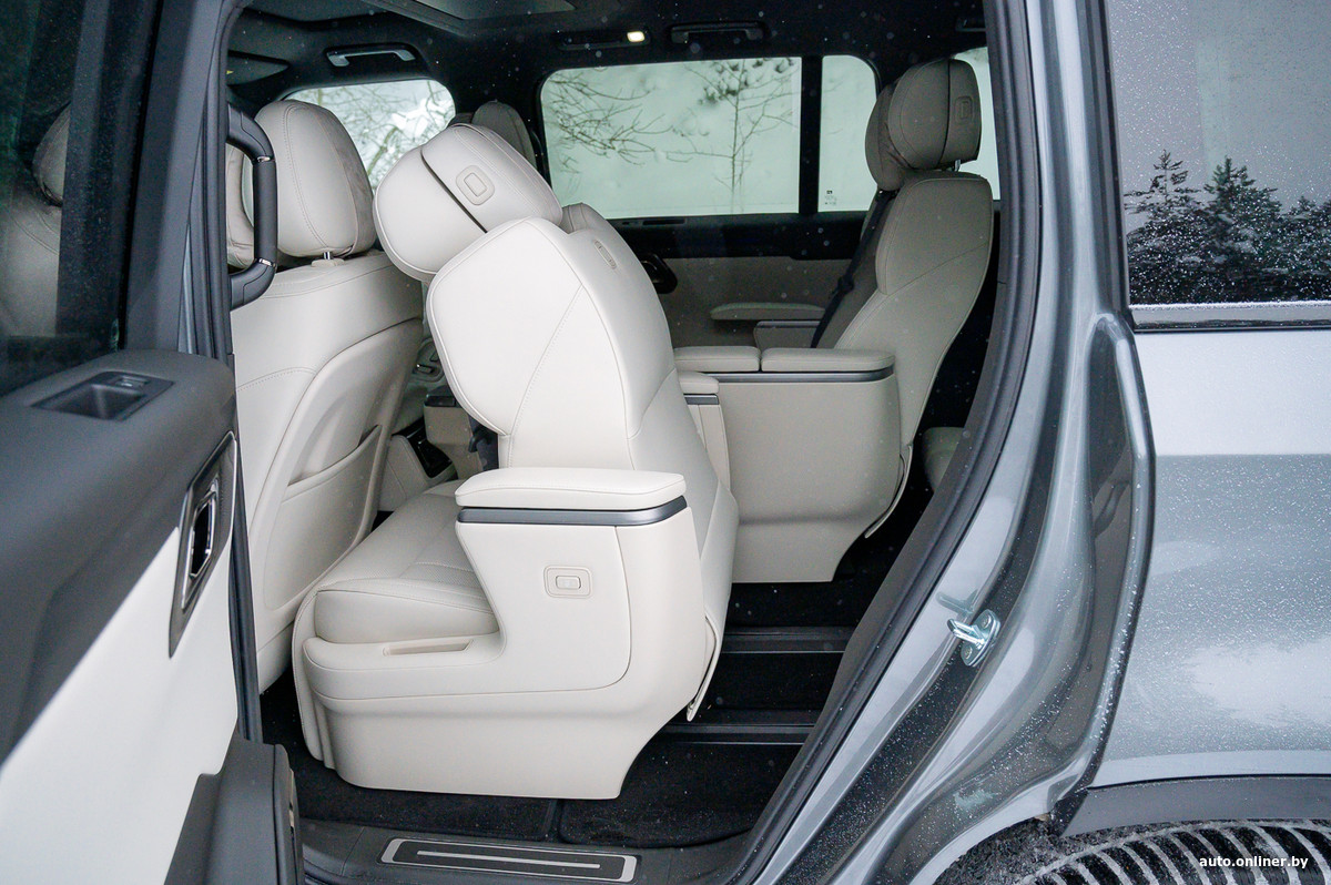 Нет уж, лучше оставаться на втором ряду. Ведь в топ-версии вы получаете не только множество регулировок, трехступенчатый подогрев, вентиляцию и массаж, но и режим отдыха. Нажал на кнопку — спинка откидывается назад, поддержка для ног поднимается, а если автомобиль стоит на месте и за рулем никого нет, то еще и водительское кресло вперед уедет.