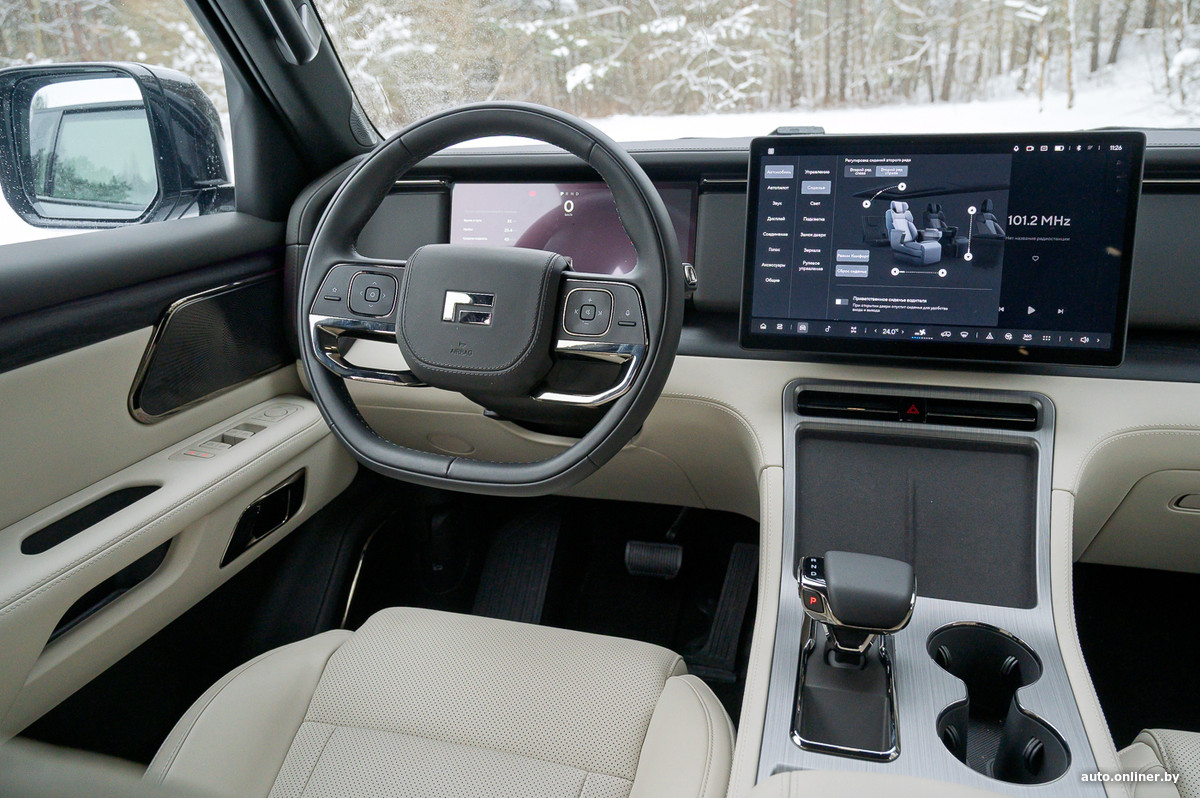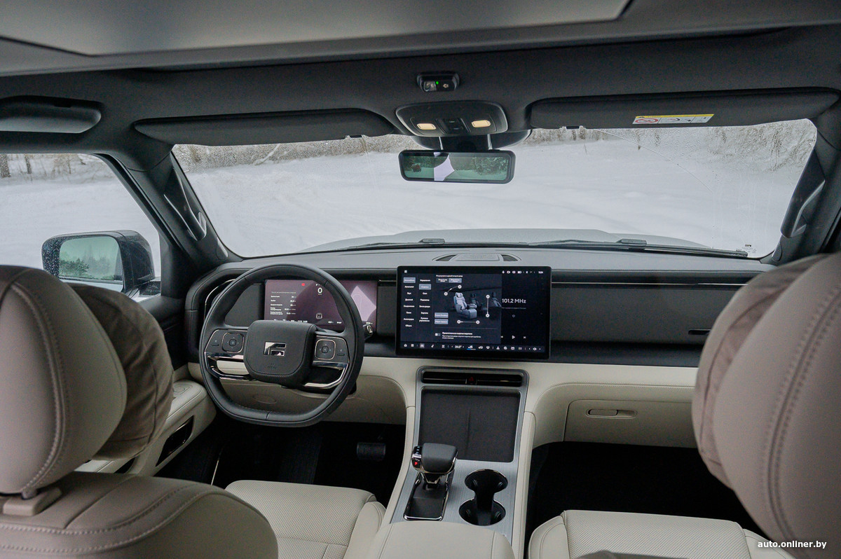 Солидные рукоятки на передних стойках, массивная передняя панель, на фоне которой 15,7-дюймовый экран мультимедийной системы не кажется таким огромным, — сидя за стильным и удобным рулем Rox 01, снова ощущаешь «монументальность» автомобиля. Но здесь нет крупных кнопок (точнее, в принципе почти нет физических клавиш), нарочито грубых деталей или стилистики под брутальный внедорожник.