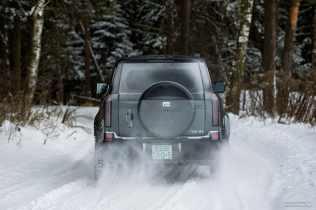 К курсовой устойчивости вопросов нет: тяжелый кроссовер с длинной колесной базой готов мчать по прямой даже по заснеженной дороге. С поворотами чуть интереснее. На том же снегу многое зависит от шин и настроек системы курсовой устойчивости — а она здесь «строгая». Ну и еще приличная масса сказывается. В общем, на скользких покрытиях Rox 01 меняет направление с ленцой, демонстрируя слегка недостаточную поворачиваемость. На асфальте реакции на поворот руля точнее, информации на самой баранке побольше, но автомобиль все равно едет так же, как выглядит, — монументально.