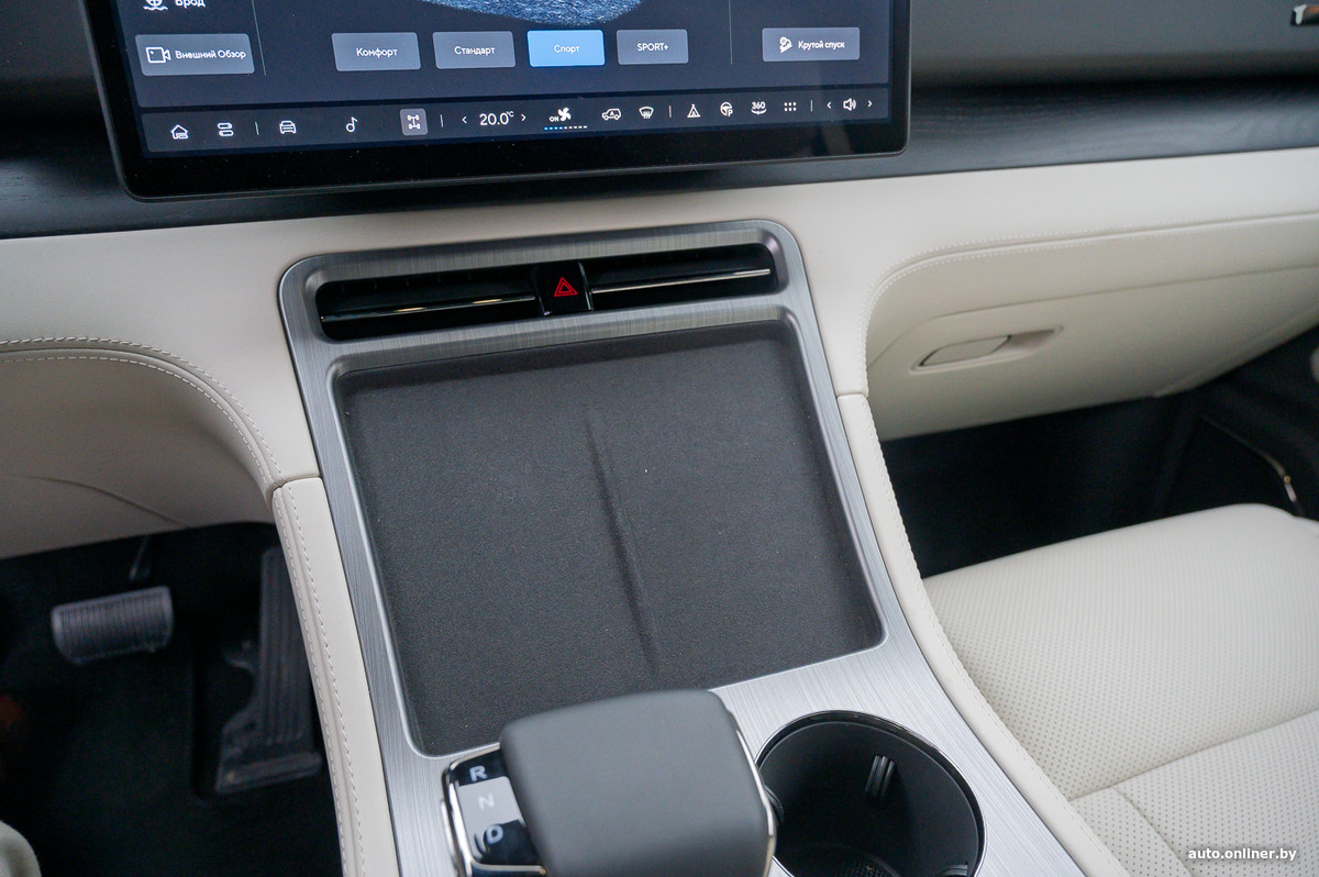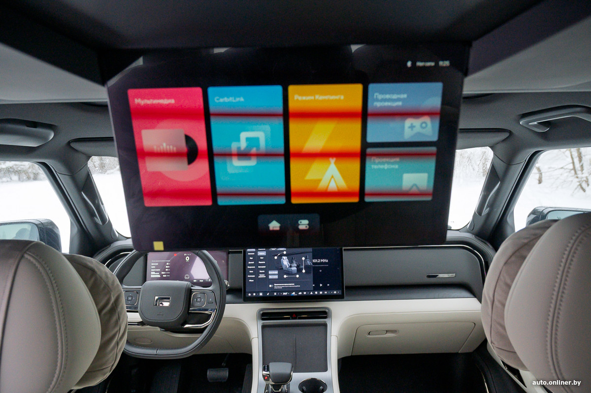 Правда, подушки кресел все же коротковаты, так что для комфортной посадки приходится или поднимать поддержку для ног, или задирать сиденье повыше. Зато, устроившись поудобнее, можно включить 15,6-дюймовый экран, который выезжает из потолочной консоли. Подключившись к нему через беспроводной CarbidLink, на него можно «зеркалить» экран своего смартфона.