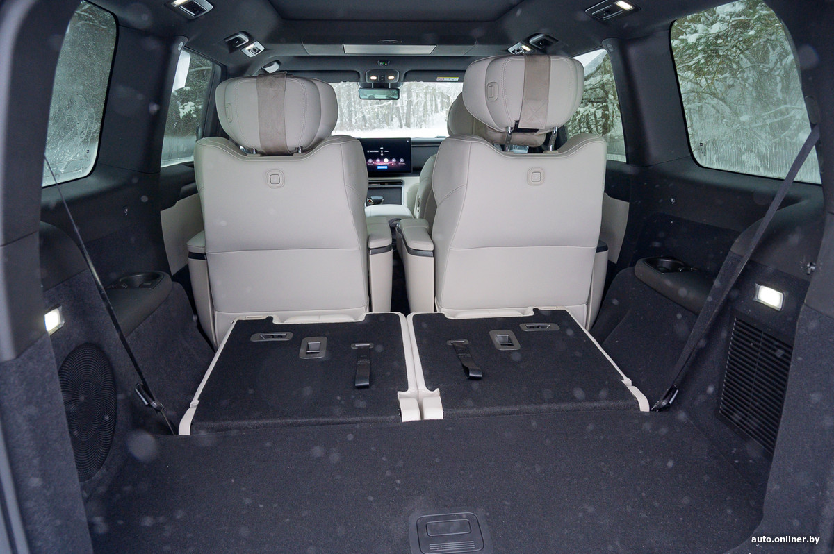 Проход на третий ряд тоже непрост: даже отодвинув при помощи электропривода массивное кресло до упора вперед, получаешь узкий лаз к двум небольшим банкеткам. Установлены они очень низко — и это откровенно детские сиденья или как раз тот случай, когда лучше плохо ехать, чем хорошо идти. Пусть даже там есть подстаканники и USB-розетки.