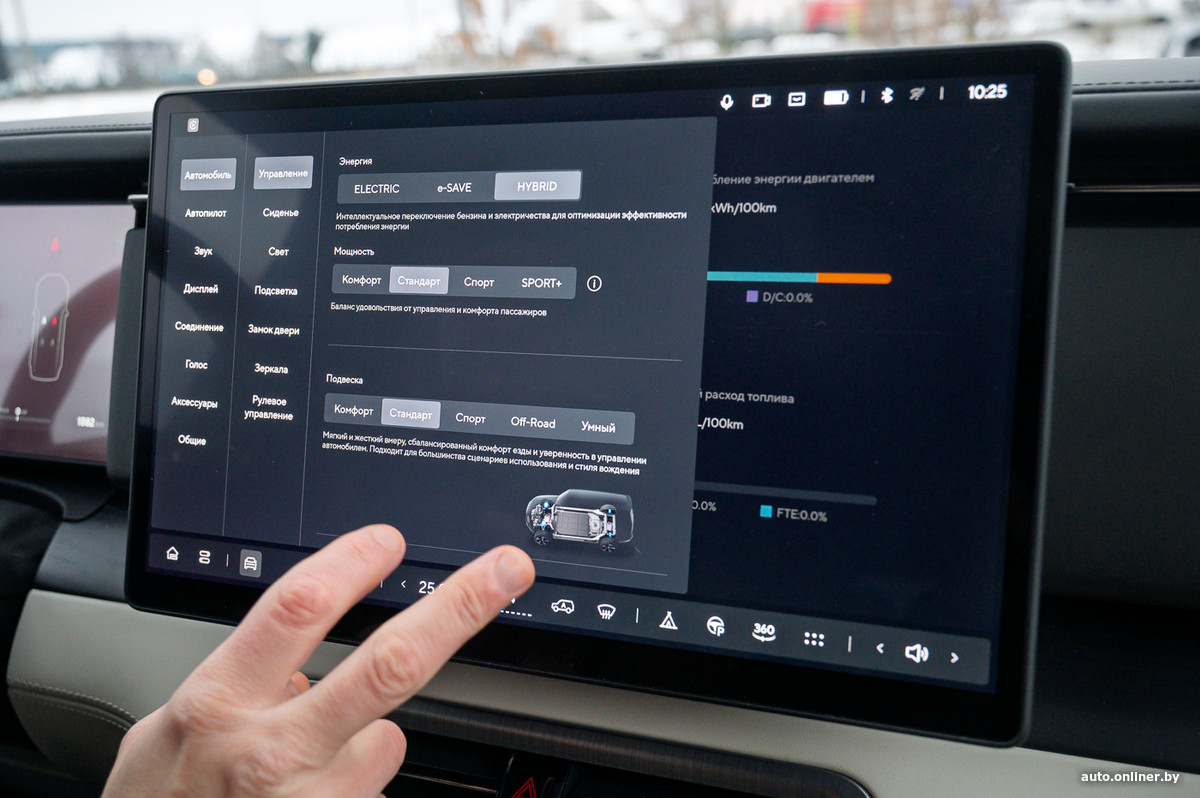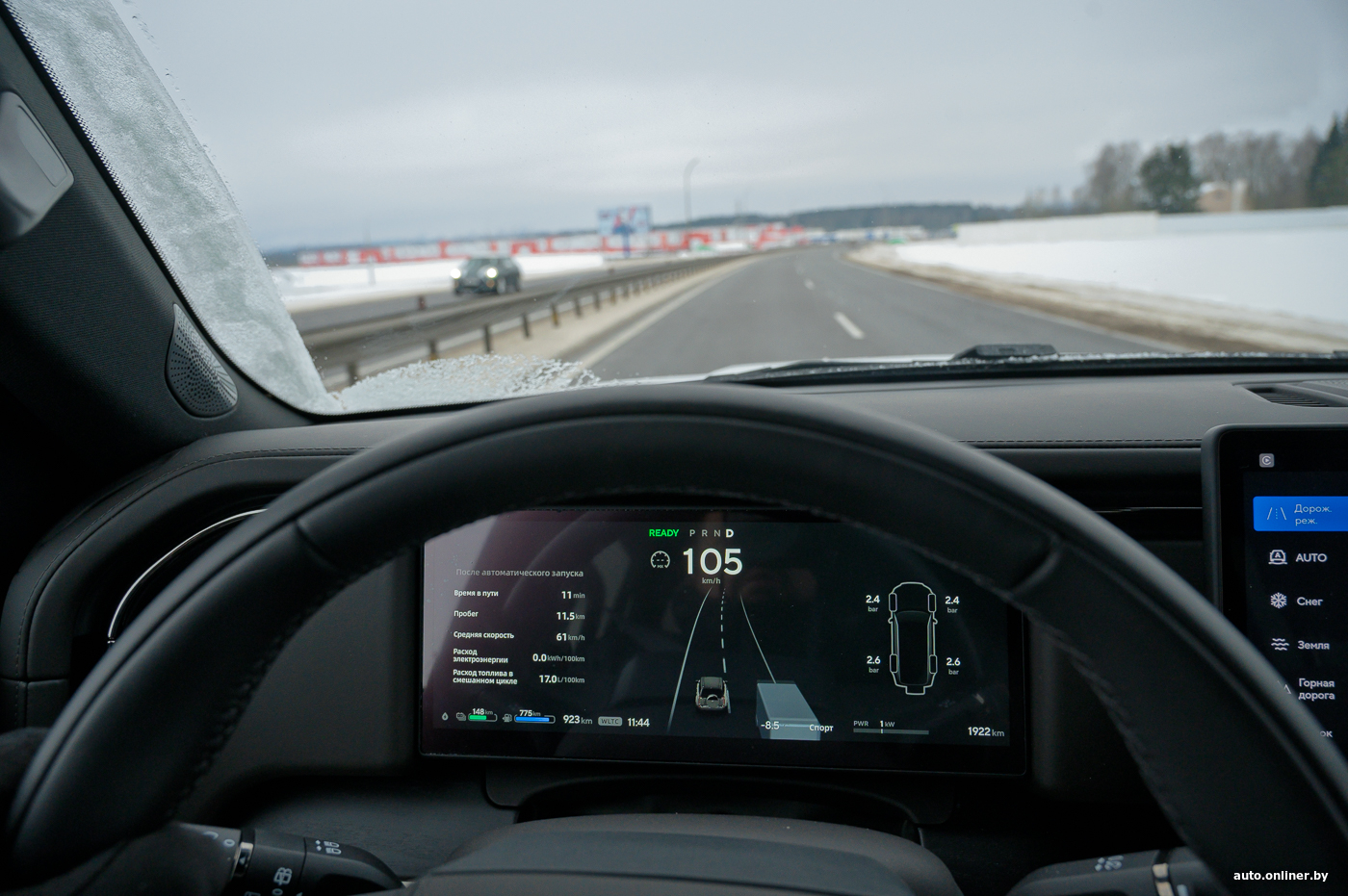 Ну а в гибридном режиме то и дело доводилось слышать ДВС: в определенных режимах он заводился, чтобы подпитать батарею, затем снова глох. В итоге поначалу нулевой расход топлива постепенно дорос до уровня 11 литров на 100 км. Как соотнести его с расходом электроэнергии — вопрос интересный, и на самом деле тут лучше подождать практического опыта владельцев. Сам же производитель декларирует общий запас хода в 1115 км по циклу WLTC. С учетом 70-литрового топливного бака это не кажется совсем уж фантастикой. Но точно не зимой и не с активным водителем за рулем.