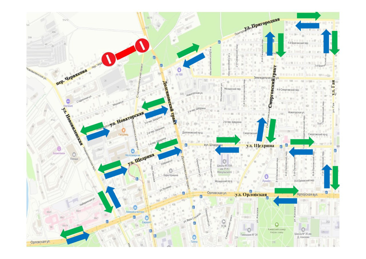 Объезд указанного участка возможен по улицам Щедрина, Новаторской, Пригородной, Гая, Нововиленской и Сморговскому тракту.
