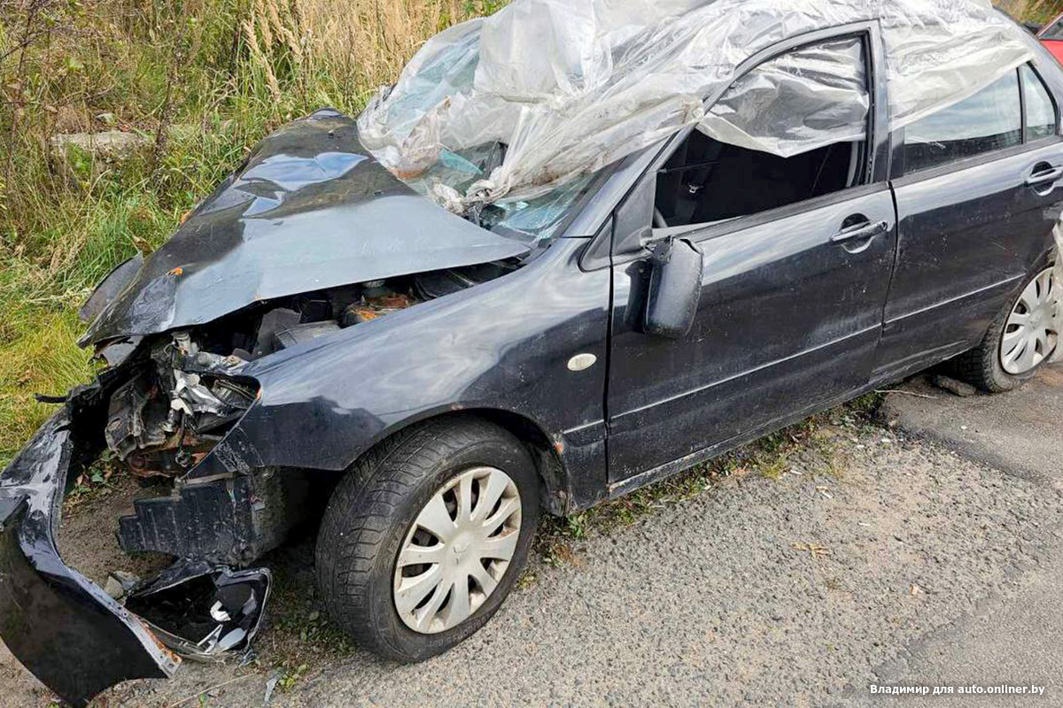 Mitsubishi с разбитым передом опрокинулась поперек полос движения. К счастью, обошлось без пострадавших.