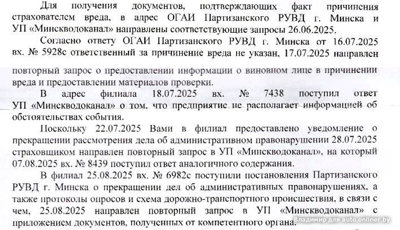 Страховая компания направляла запросы в ГАИ и УП «Минскводоканал» для получения документов, подтверждающих факт причинения вреда. Интересно то, что, как указано в документе, от УП «Минскводоканал» страховая компания по крайней мере дважды получала ответ о том, что предприятие не располагает информацией об обстоятельствах события.