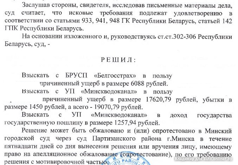 Снова интересно. В судебном решении содержится информация о том, что гражданская ответственность УП «Минскводоканал» застрахована по договору добровольного страхования гражданской ответственности и расходов организаций, создающих повышенную опасность для окружающих. Застрахована той же страховой компанией, куда обращался Владимир. «В адрес ответчика истцом 11.09.2025 была направлена претензия с предложением добровольно возместить ущерб и убытки, однако ответа на претензию не поступило, ущерб не возмещен», — указано в судебных материалах.