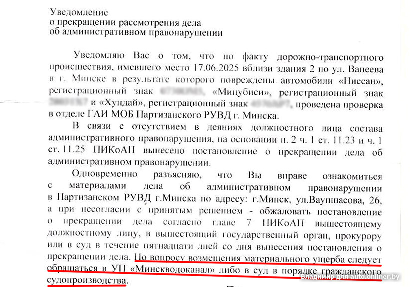 В том самом уведомлении из ГАИ, впрочем, указано, что постановление о прекращении дела об административном правонарушении вынесено «в связи с отсутствием в деяниях должностного лица состава административного правонарушения». Сказано и то, что «по вопросу возмещения материального ущерба следует обращаться в УП „Минскводоканал“ либо в суд в порядке гражданского судопроизводства».