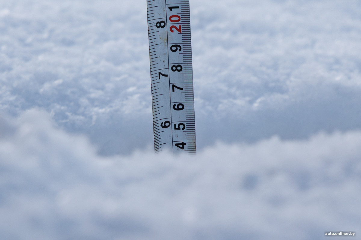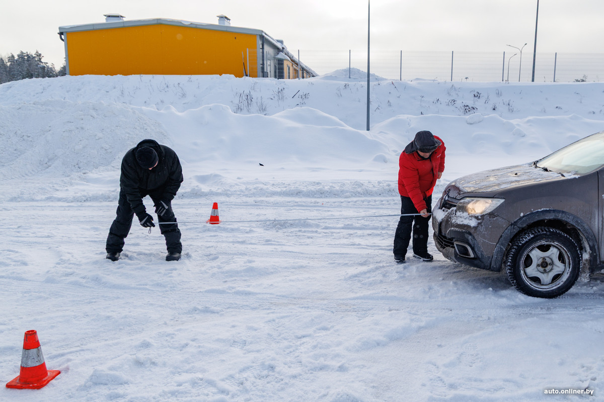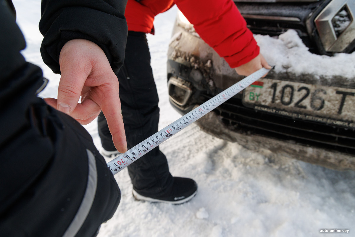 Попытка проехать змейку не на «Жигулях», а на Renault, но на летней резине, провалилась окончательно. Как провалился и третий сравнительный тест. На зимних же шинах автомобиль без проблем разворачивался через условный нечищенный дворик. Мы замерили высоту снежного покрова: от 15 до 25 сантиметров. После Улли было больше, короче говоря.