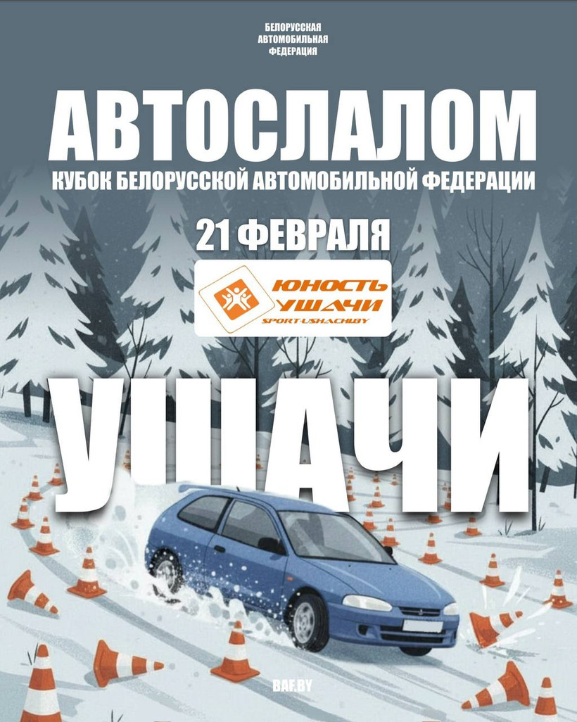 В том же Ушачском районе состоятся и соревнования по автомобильному слалому — «Кубок БАФ». Если говорить простым языком, то фигурное вождение на специально оборудованной и размеченной дорожными конусами площадке на время. Регламент соревнований доступен по ссылке.