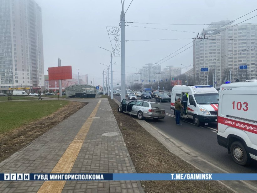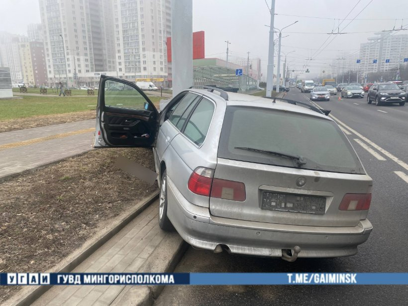 Утром на проспекте Независимости возле дома №134 20-летний водитель BMW ехал по дороге, но вдруг выехал на встречную полосу, а потом съехал с проезжей части и врезался в осветительную мачту.