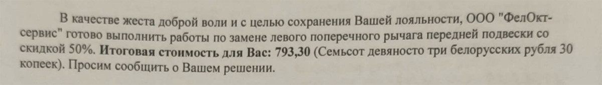 При этом компания «в качестве жеста доброй воли» предложила 50%-ную скидку на замену левого поперечного рычага передней подвески.