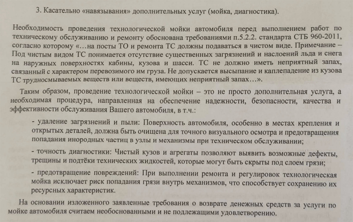 К слову, в своей претензии Сергей также пожаловался на навязывание платных услуг, а именно технологической мойки при сдаче автомобиля в ремонт. Вот что на это ответили в компании: