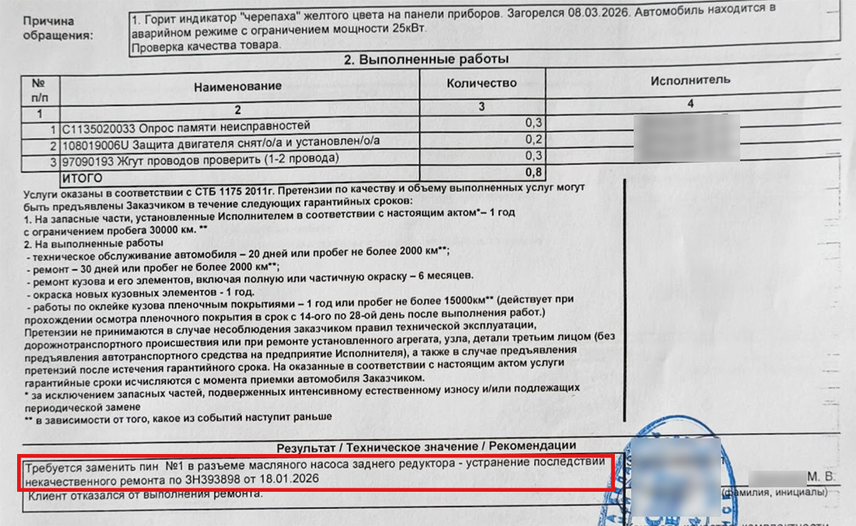 А в январе на приборной панели автомобиля появился индикатор «Черепаха» (режим ограничения мощности, который активируется при критически низком заряде батареи, ее перегреве или неисправности системы — исходя из данных в интернете). Сервис проблему исправил, но в марте она возникла вновь, после чего мужчина потребовал провести проверку качества товара. И как указано в заказ-наряде от 10 марта 2026 года, в январе был проведен некачественный ремонт, из-за чего «черепаха» появилась снова. Мы пересказываем факты сухо и кратко, однако Сергей был недоволен многими нюансами работы сервиса. В своем рассказе мужчина подчеркнул — он не один такой недовольный клиент у компании. Мол, в тематическом чате в Telegram можно найти и другие негативные отзывы.