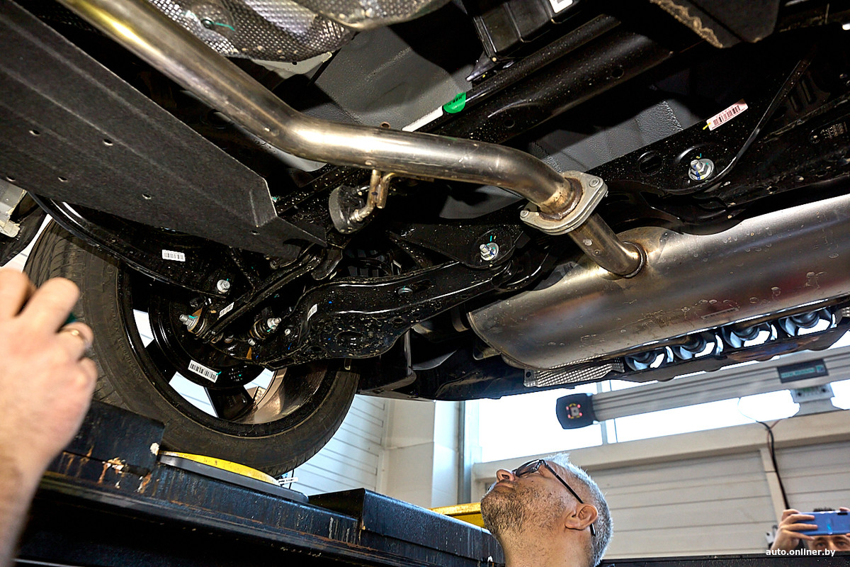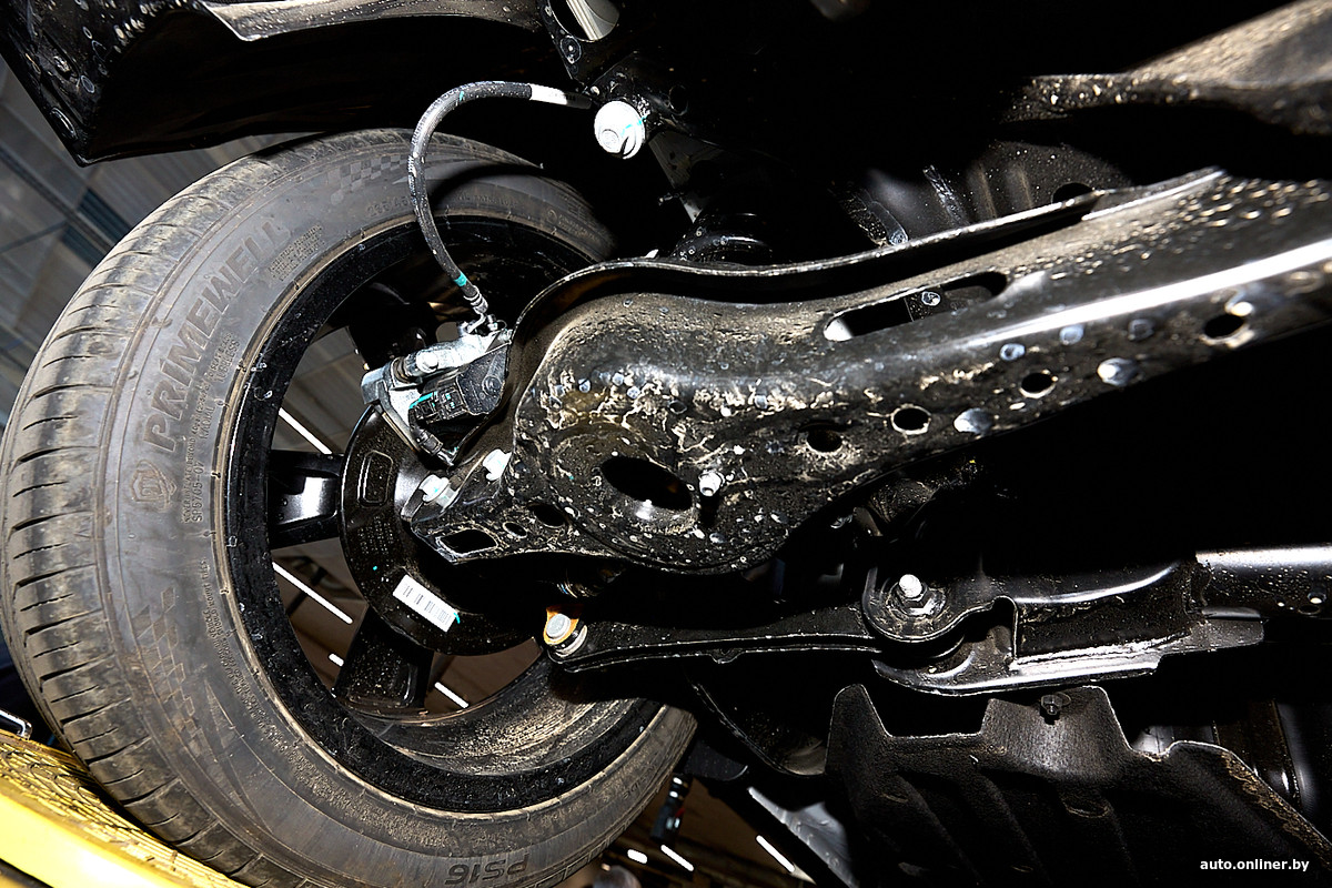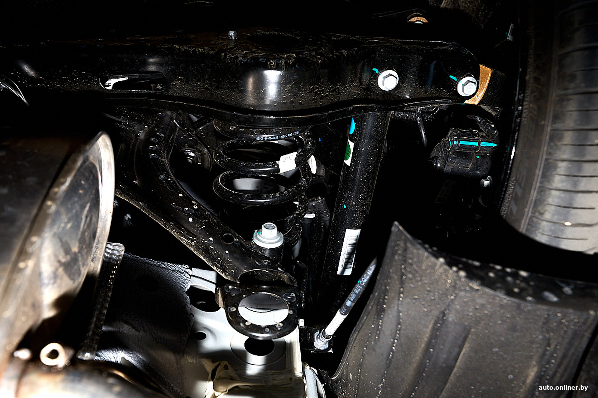 Пользуясь случаем, внимательно изучаем независимую заднюю подвеску, которая визуально напоминает многорычажку Atlas. Несоставной цельносварной подрамник, три поперечных рычага и один продольный плюс стабилизатор поперечной устойчивости. Здесь регулируется только развал.