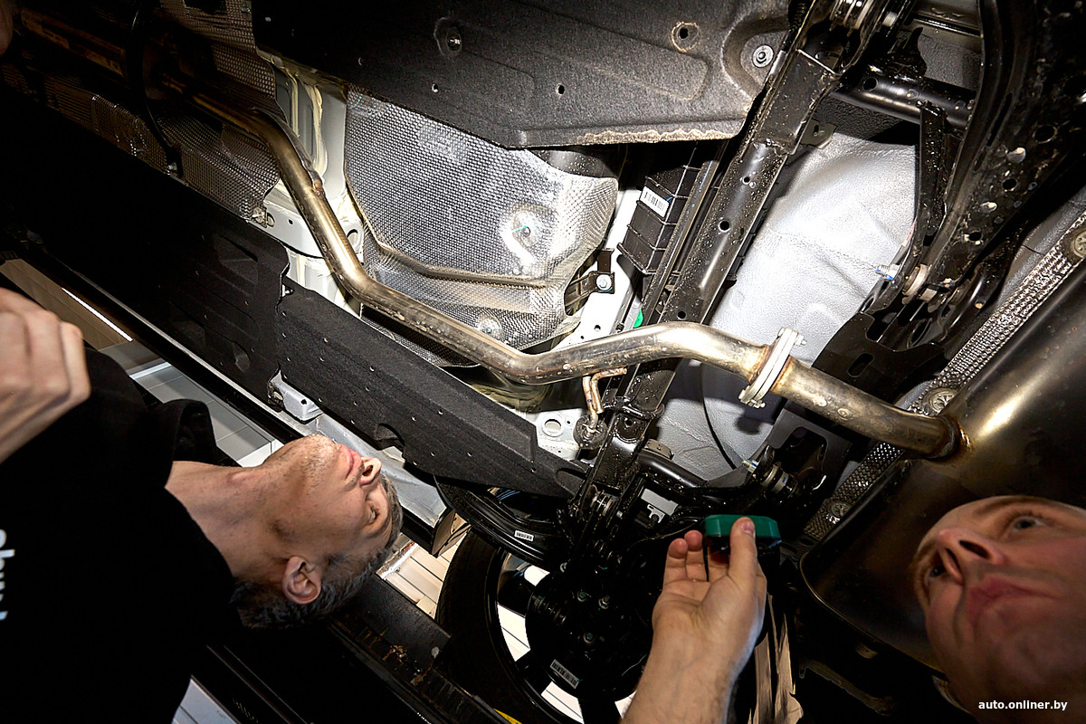 На подъемнике можно увидеть, что днище частично прикрыто щитками, однако некоторые участки остаются открытыми, далеко не все места прикрыты пластизолем, так что дополнительный антикор не помешает. Топливный бак закрыт отдельным термоэкраном.