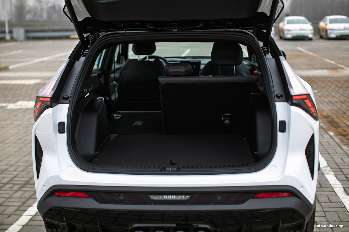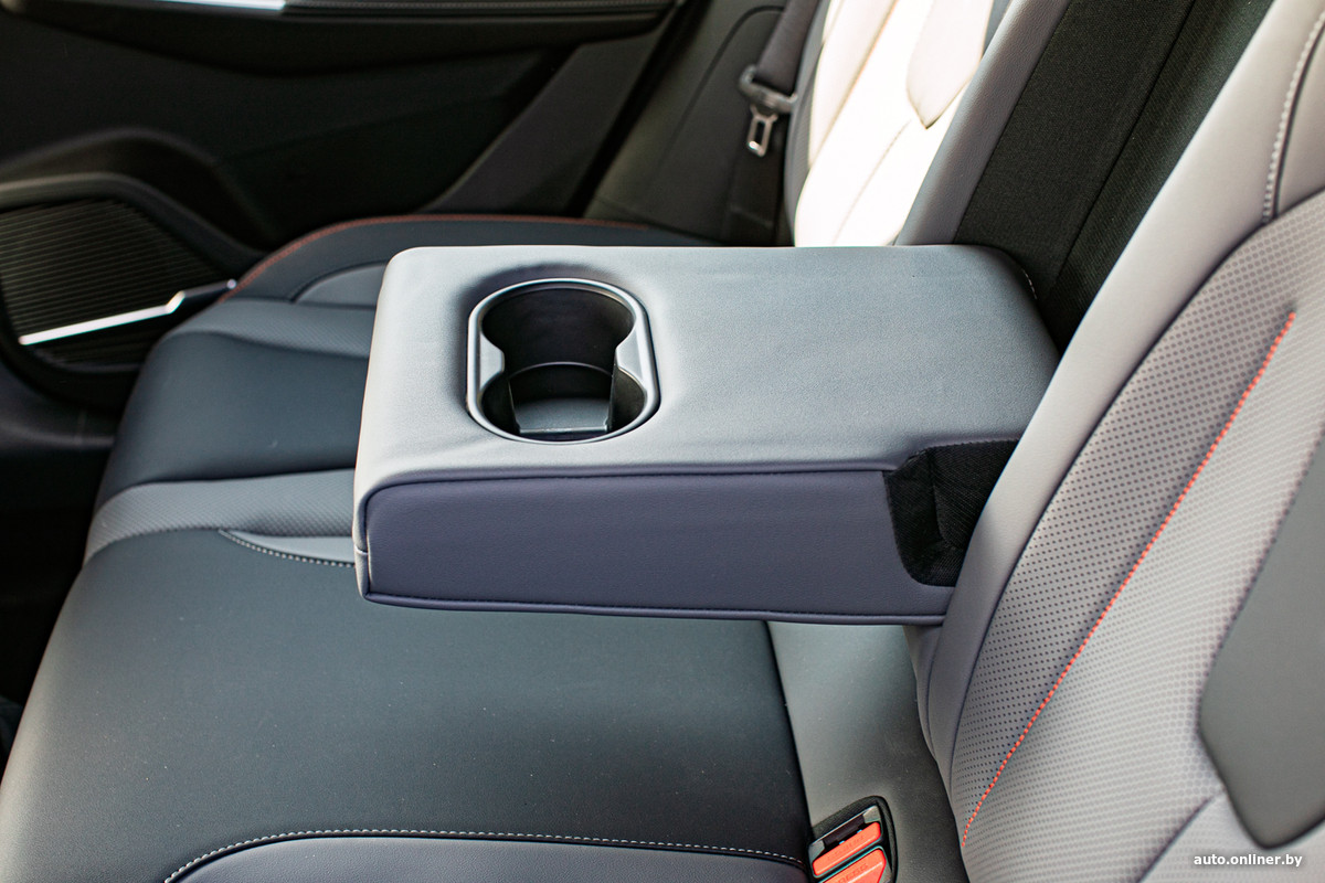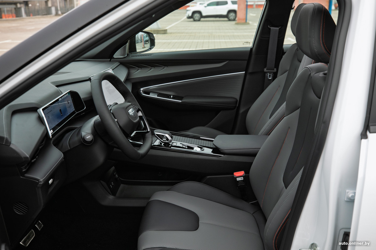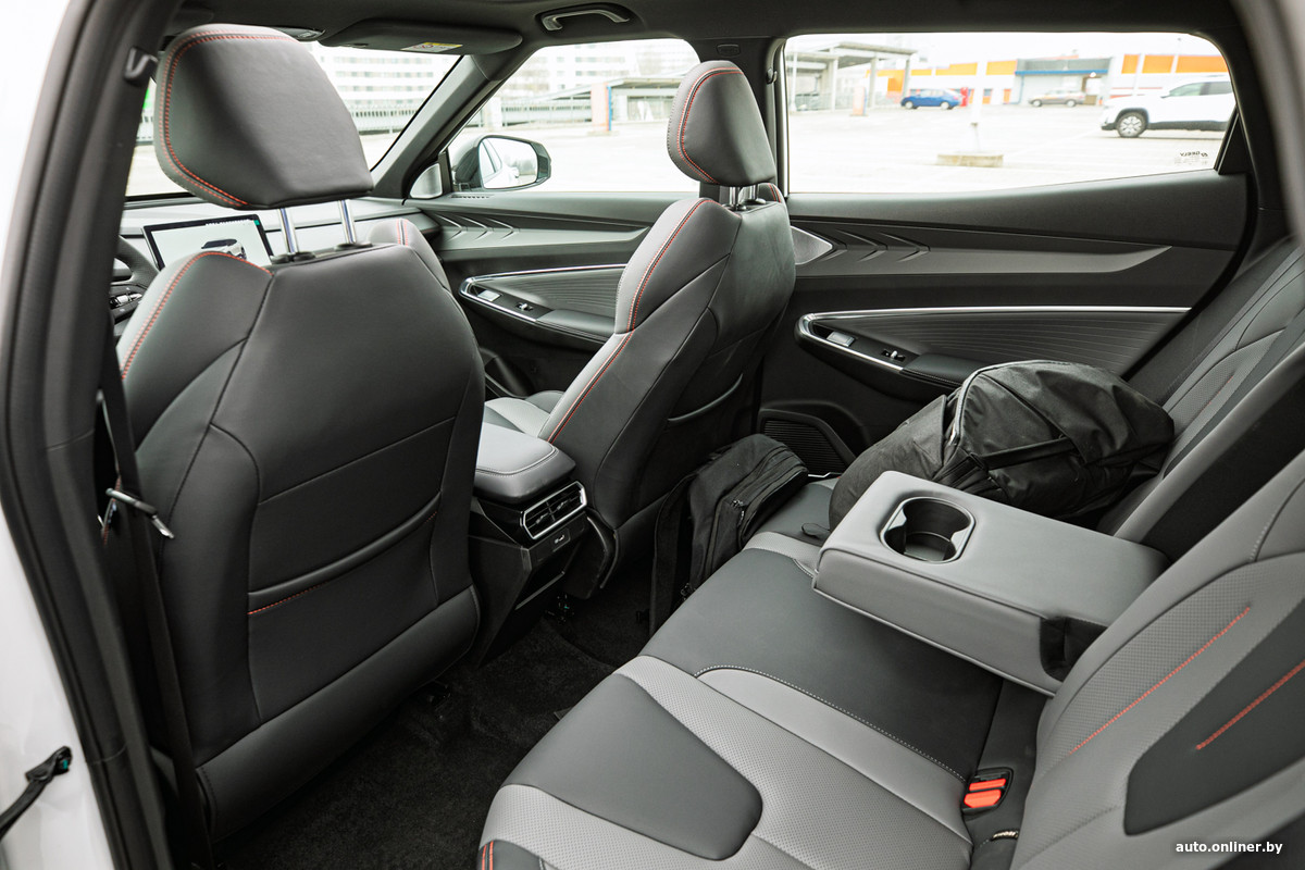Вот у задних пассажиров опций немного: подлокотник с открытыми подстаканниками да одна-единственная розетка. А чтобы включить или выключить подогрев сидений, придется просить водителя или штурмана. Зато места заметно больше, чем в Coolray, притом что высоко установленный диван не вынуждает вытягивать ноги. Довольно большой угол наклона спинки — на любителя, но неудобства это не вызывает.