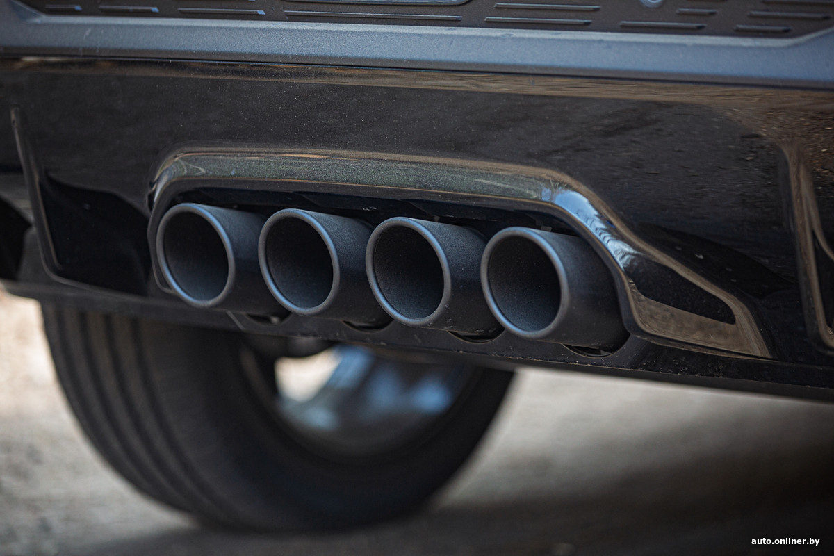 В исполнении Flagship Sport кроссовер щеголяет двухцветной окраской кузова, и в случае с основным белым черные крыша, рейлинги и спойлер смотрятся особенно контрактно. А вот 19-дюймовые колеса с черными дисками, наоборот, несколько теряются. Зато не заметить четыре патрубка выпускной системы по центру заднего бампера никак нельзя. Ну, хотя бы в данном случае число труб соответствует количеству цилиндров…