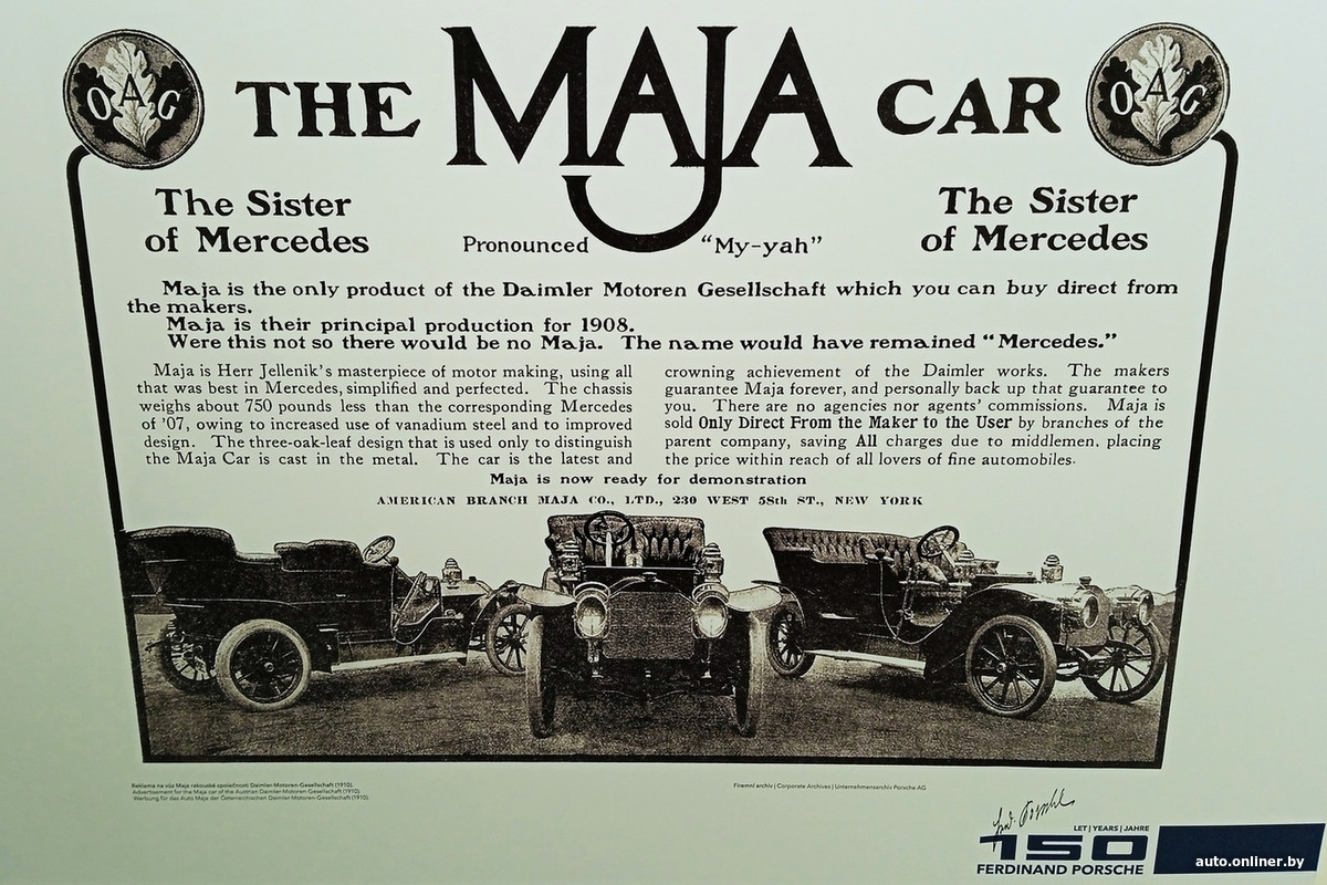 В 1906 году Порше покидает Jacob Lohner и становится главным конструктором Austro-Daimler, австрийского филиала компании Daimler. Там он разрабатывает свои первые автомобили с привычным ДВС, то есть без электрического довеска. Выпускались они под именем Maja с подачи небезызвестного Эмиля Еллинека — дипломата и финансового магната, с легкой руки которого имя его старшей дочери Мерседес стало известной во всем мире маркой автомобиля. Те машины оснащались 5,7-литровой «четверкой», создавались уже без участия немецкого Daimler и были названы в честь младшей дочери Еллинека и сводной сестры Мерседес. Впрочем, покупатели «Майю» вниманием совсем не жаловали — на рынке эта марка долго не продержалась.