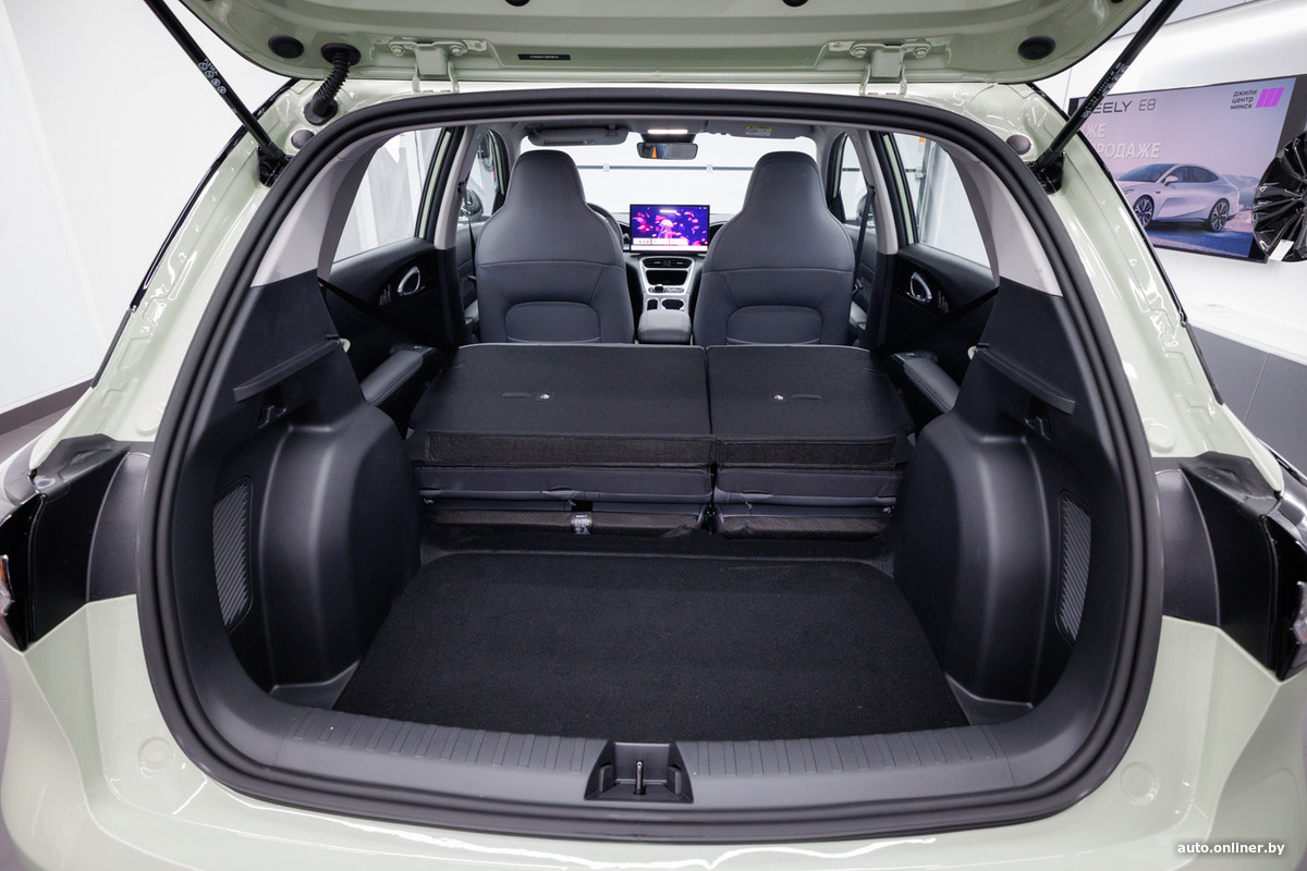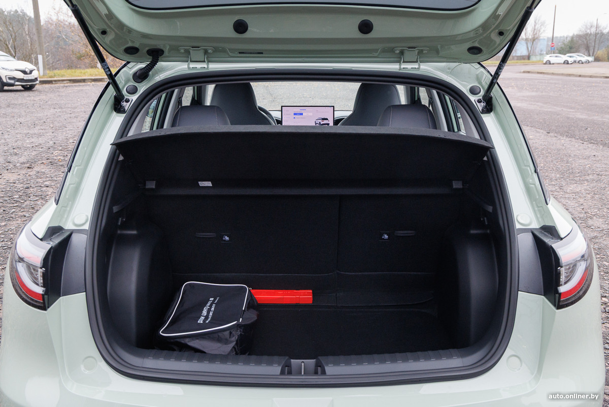 Например, многие модели лишены заднего стеклоочистителя. Вот и на ЕХ2 его нет. Зато багажная полка на месте. А вот освещение отсека, опять же, отсутствует. Заявленный объем — 375 литров, а если сложить спинку дивана, то можно получить до 1320. Жаль, что при этом образуется заметная ступенька по высоте, да и порог массивный — погрузка и выгрузка габаритных и тяжелых вещей не будет простой. Для мелочовки кармашков не предусмотрено, хотя пластиковые боковины имеют подходящие выштамповки, а подполья нет в принципе — вы же помните, что внизу расположен электромотор?