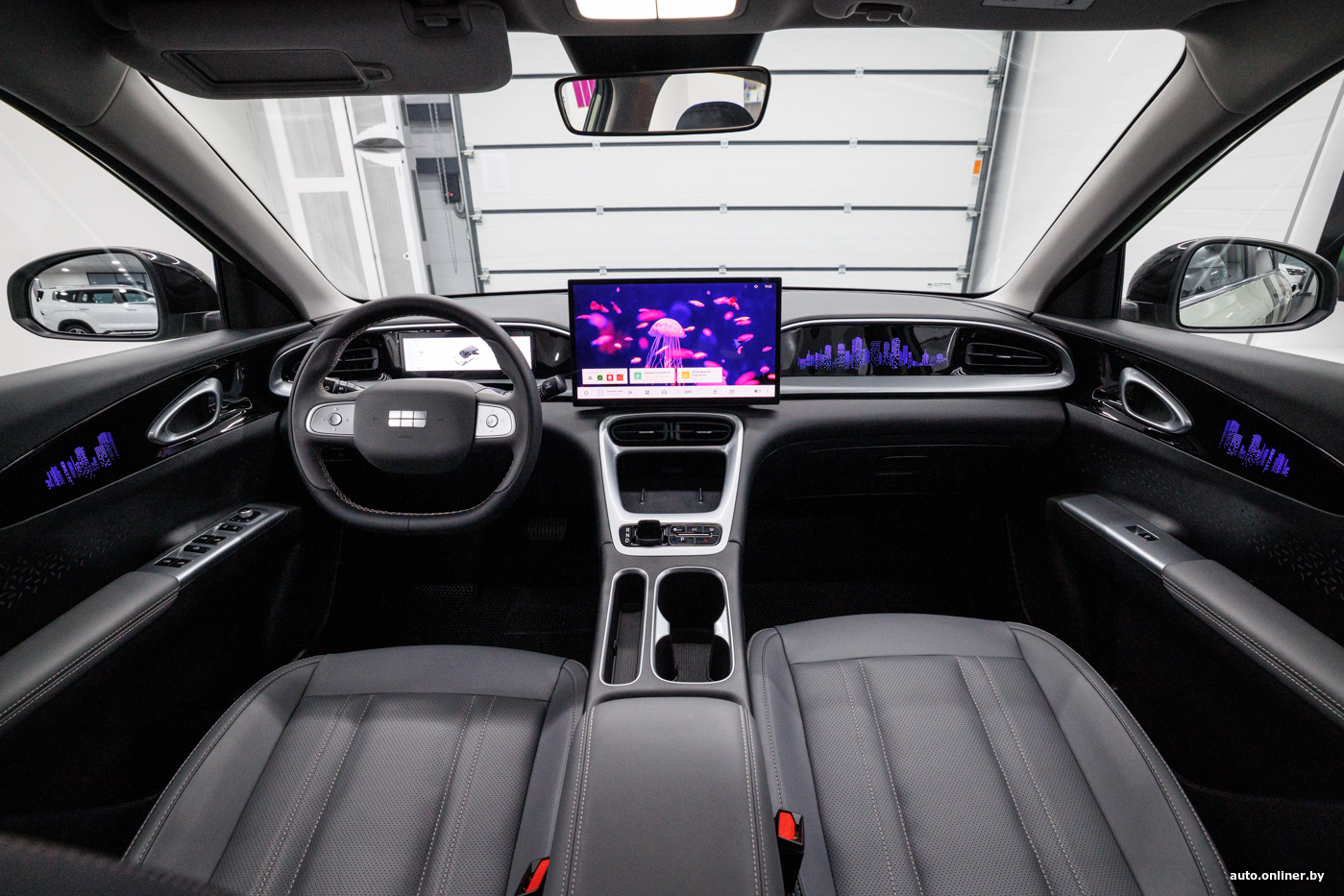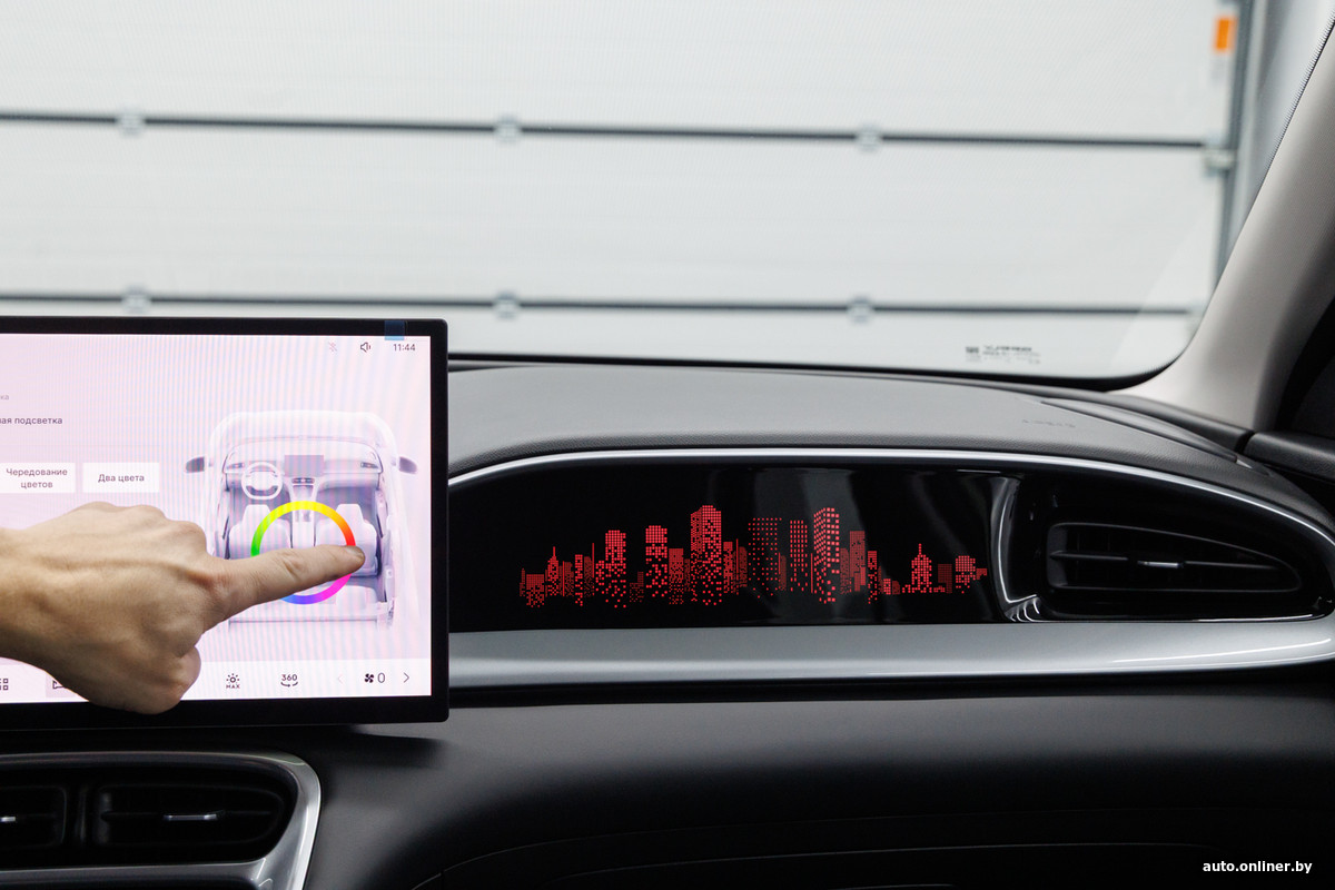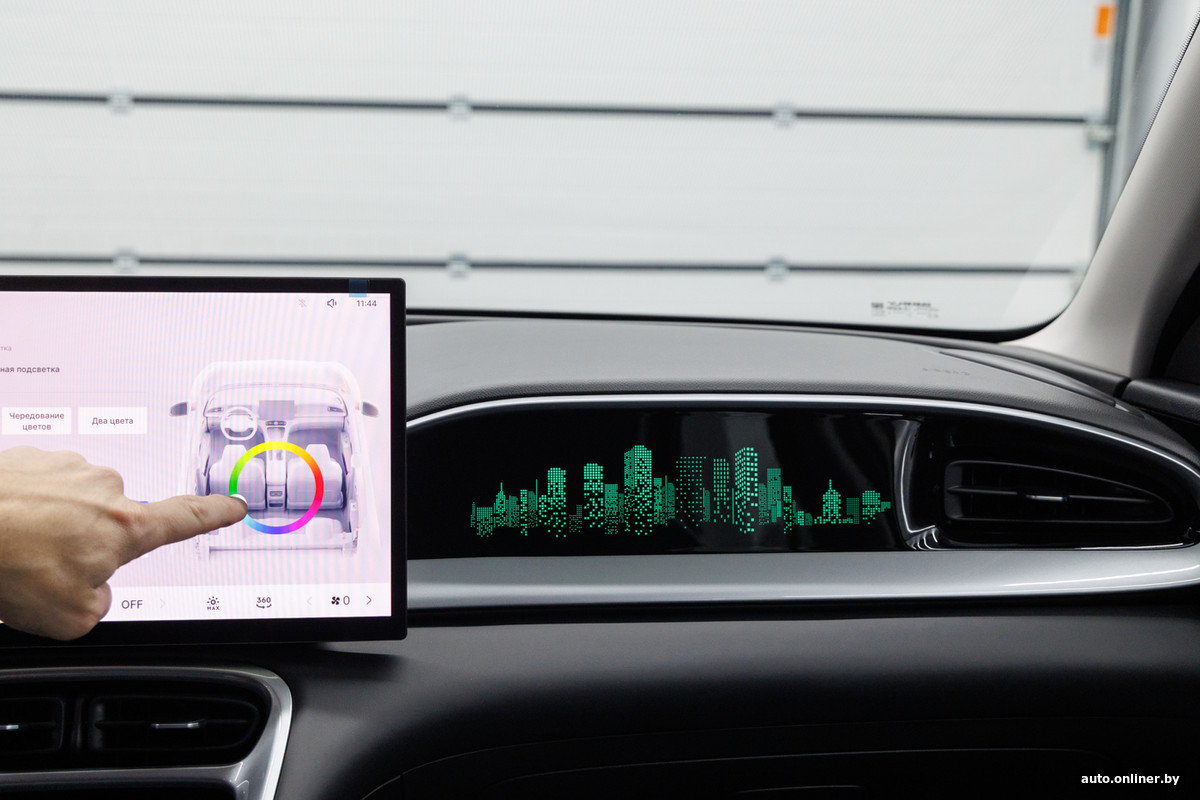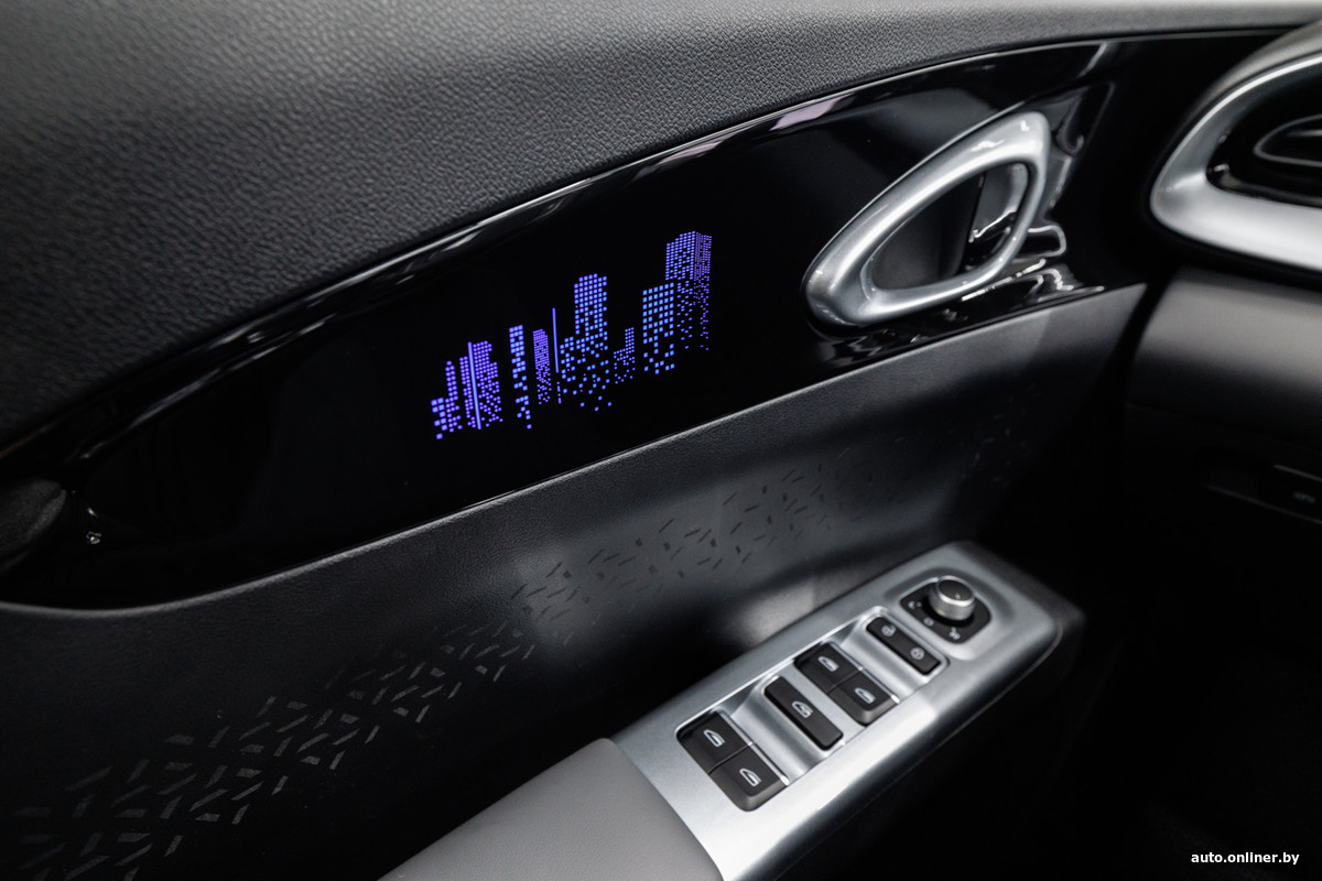 Черно-серый интерьер, выполненный из пластика и искусственной кожи, оживляют серебристые вставки, но главным образом — амбиентная подсветка: многоэтажки на передней панели и дверных картах можно окрашивать в любой цвет.