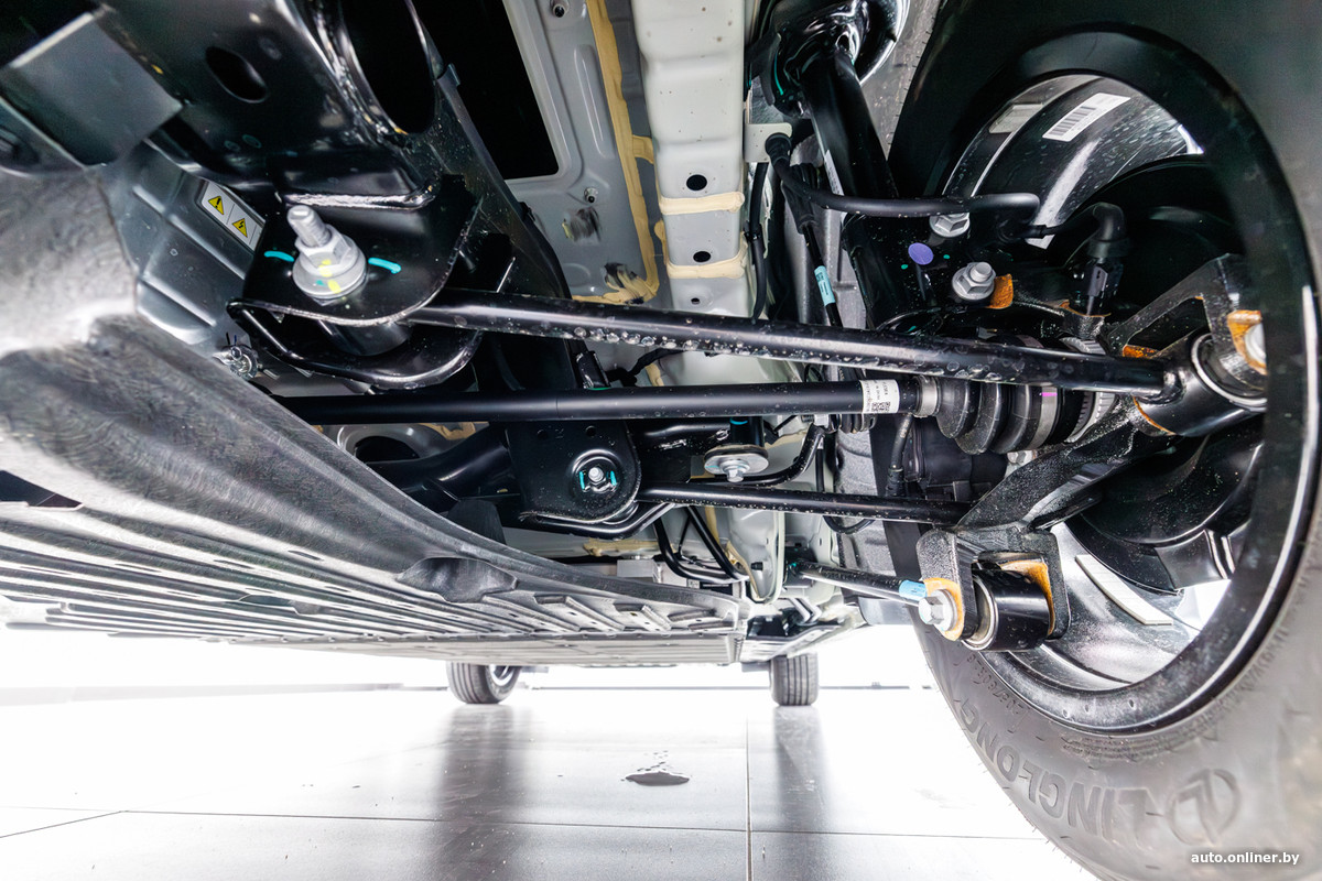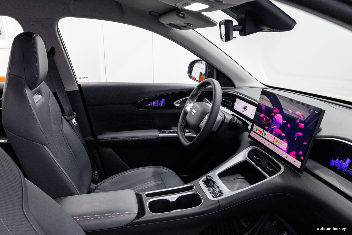 Небольшой спойлер. Аккумулятор интегрирован в кузов, а электродвигатель установлен на задней оси. Соответственно, сзади применена независимая многорычажная подвеска, а спереди — традиционные для большинства легковых автомобилей стойки McPherson. Горим желанием узнать, каков ЕХ2 в движении. Но запасемся терпением и пока изучим его внутренний мир.