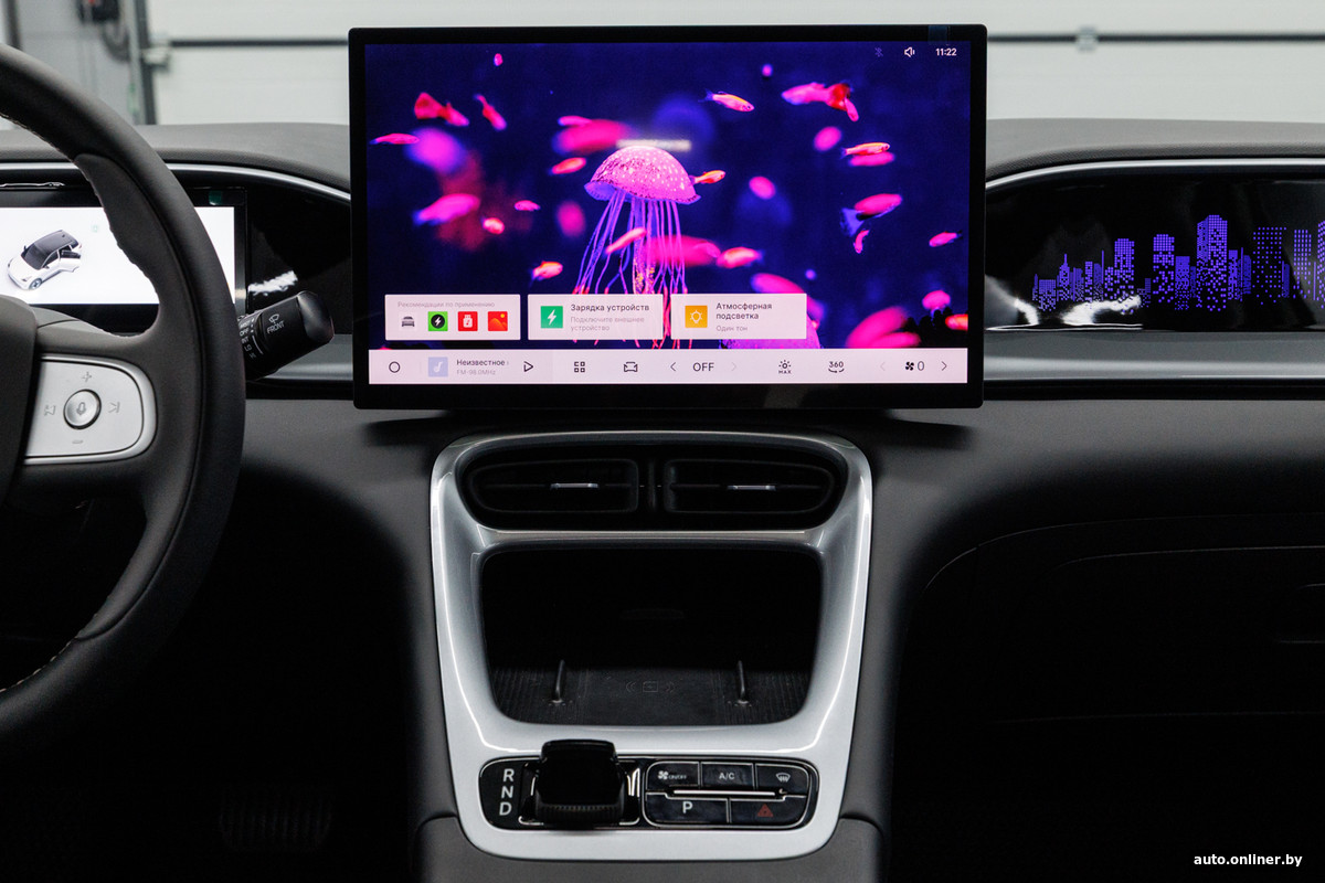 На парящей центральной консоли разместилась зарядная площадка мощностью 50 Вт, рядом с ней — небольшой переключатель, отвечающий за выбор ездового режима, а также несколько физических кнопок. Но полноценное управление климатической системой (к слову, автоматический режим мы в ней не обнаружили) — через 14,6-дюймовый экран мультимедиа.