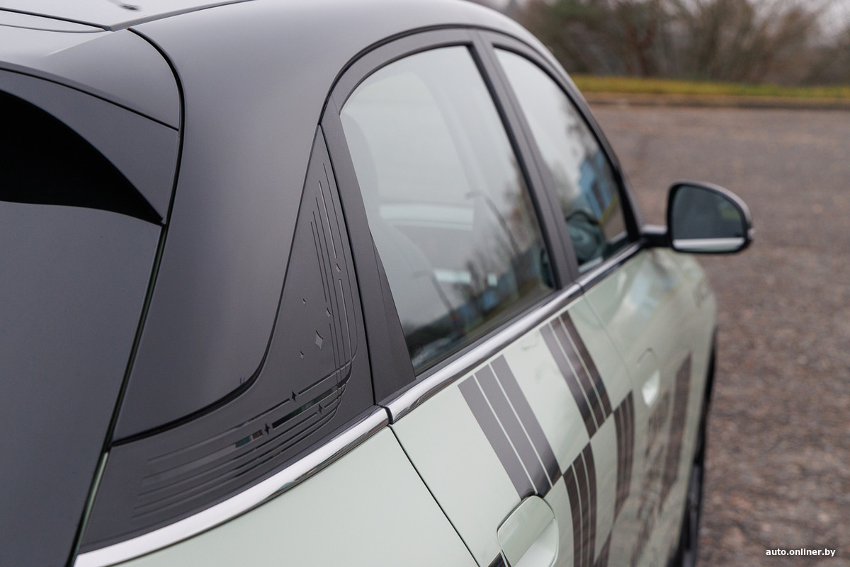Черные корпуса зеркал и крыша (на самом деле это не краска, а пленка) в сочетании с неокрашенными пластиковыми накладками по низу кузова обеспечивают контраст, благодаря которому ЕХ2 выглядит более солидно и дорого. А еще притягивают внимание колесные диски необычного дизайна. Удивительно, но дизайнеры обошлись без выдвижных ручек и безрамочных дверей, но решились на хромированные молдинги. А еще они проявили фантазию при оформлении задних стоек крыши. Присмотритесь: на пластиковых накладках имеется рисунок.