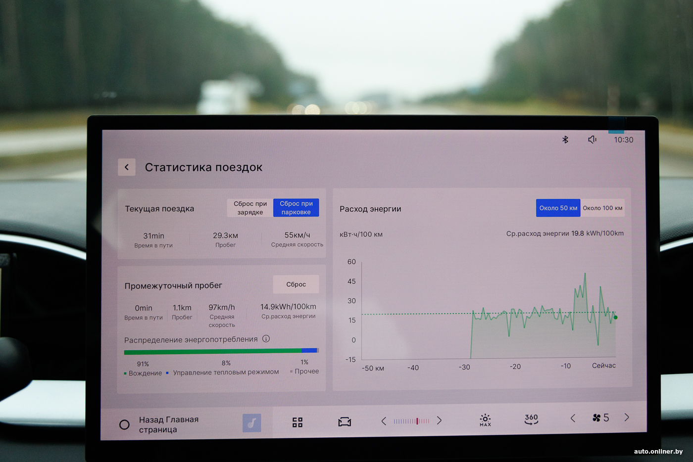 Судите сами. В городских условиях сам автомобиль оценивал расход энергии в 12—15 кВт·ч на сотню, при активной езде или при движении по трассе временами доходило до 20—21 кВт·ч, ну а в комбинированном режиме город/трасса без резких ускорений, но и без очевидной экономии получалось порядка 14—17 кВт·ч. Несмотря на то что для модели заявлен тепловой насос, на работу климат-контроля приходилось от 8 до 18% в зависимости от условий движения.