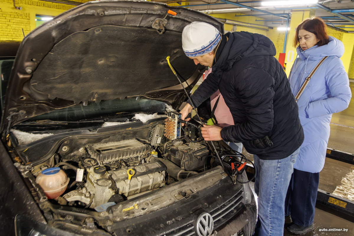 Первым решается проверить свою АКБ минчанин по имени Александр. В ТЦ он приехал на Fiat, принадлежащем сыну. По словам мужчины, батарея здесь новая — ей буквально месяц. Свой автомобиль Александр тоже подготовил к следующей волне морозов (если она будет):