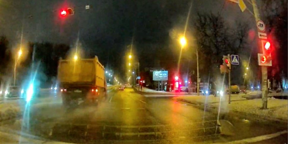 Один водитель успевает остановиться, когда загорается запрещающий сигнал светофора, другой — нет. Причем второй — за рулем тяжелого грузовика, который быстро не остановишь, резко на нем не повернешь. Рискованный маневр попал на запись видеорегистратора.